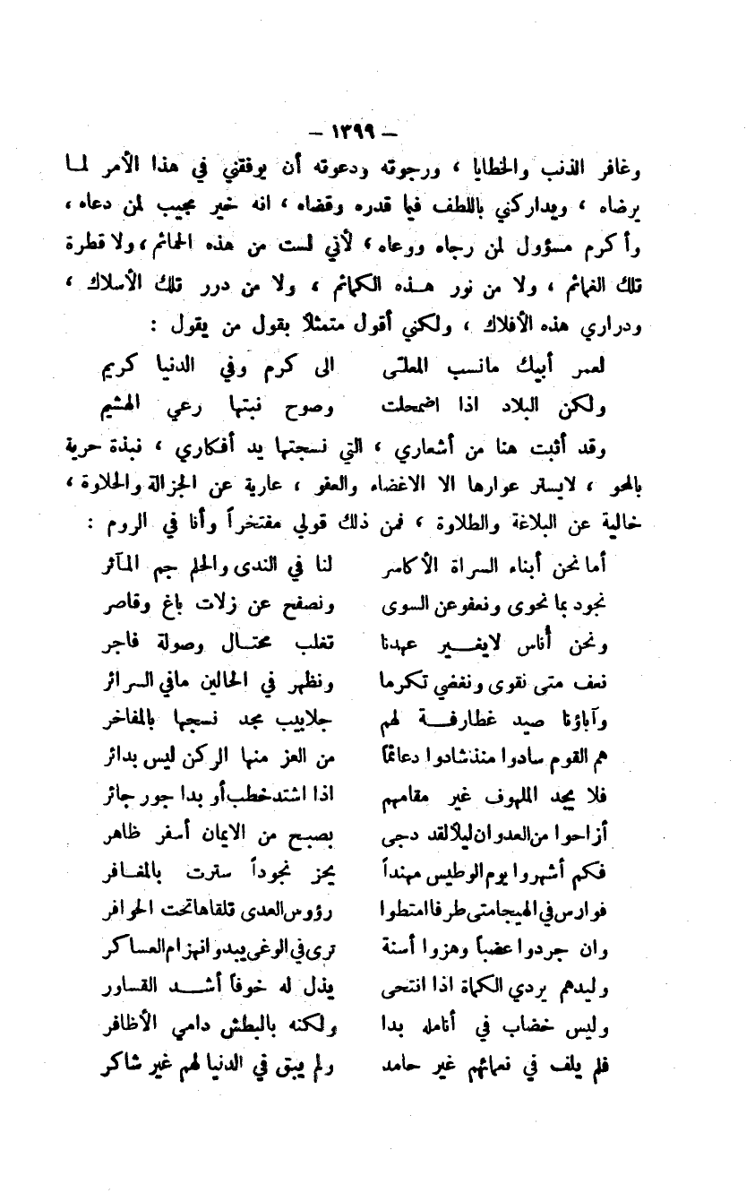 وقد أثبت هنا من أشعاري، التي نسجتها يد أفكاري، نبذة حربة بالمحو، لا يستر عوارها إلا الإغضاء والعفو، عارية عن الجزالة والحلاوة، خالية عن البلاغة والطلاوة، فمن ذلك قولي مفتخراً وأنا في الروم: