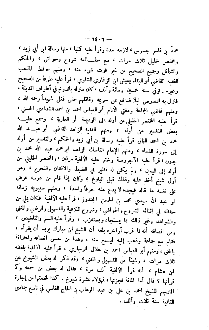 محمد بن قاسم جسوس، لازمه مدة وقرأ عليه كتباً، منها رسالة ابن أبي زيد، ومختصر خليل ثلاث مرات، مع مطالعة شروح وحواش، والحكم والشمائل وجميع الصحيح من غير فوت شيء منه، ومنهم حافظ المذهب الفقيه القاضي أبو البقاء يعيش ابن الزغاوي الشاوي، قرأ عليه طرفاً من الصحيح وغيره. توفي سنة خمسين ومائة وألف، كان منزله بالدوخ في أطراف المدينة، فنزل به اللصوص ليلاً فدافع عن حريمه وقاتلهم حتى قتل شهيداً رحمه الله تعالى، ومنهم قاضي الجماعة ومفتي الأنام أبو العباس أحمد بن أحمد الشدادي الحسني، قرأ عليه المختصر الخليلي من أوله إلى الوديعة أو العارية، وسمع عليه بعض التفسير من أوله، ومنهم الفقيه الزاهد القاضي أبو عبد الله محمد بن أحمد التماق قرأ عليه رسالة بن أبي زيد والحكم، والتفسير من أوله إلى سورة النساء، ومنهم الإمام الناسك الزاهد أبو محمد عبد الله محمد بن جلون، قرأ عليه الآجرومية وختم عليه الألفية مرتين، والمختصر الخليلي من أوله إلى اليمين، ولم يكن له نظير في الضبط والإتقان والتحرير، وهو أول شيخ أخذ عليه وذلك قبل البلوغ، وكان إذا قام من درسه عرض على نفسه ما قاله فيجده لا يدع منه حرفاً واحداً، ومنهم سيبويه زمانه أبو عبد الله سيدي محمد بن الحسن الجندوز، قرأ عليه الألفية فكان يملي من حفظه في أثنائه الشروح والحواشي، وشروح الكافية والتسهيل والرضي والمغني والشواهد وغير ذلك مما يستجاد ويستغرب، وقرأ عليه السلم والتلخيص، ومن إنصافه أنه لما قرب أواخره بلغه أن الشيخ ابن مبارك يريد أن يقرأه، فقام مع جماعة وذهب إليه ليسمع منه، وهذا من حسن إنصافه واعترافه بالحق، ومنهم أبو العباس أحمد بن علال الوجاري، قرأ عليه الألفية بلفظه ثلاث مرات، وشيئاً من التسهيل والمغني، وقد ذكر له بعض الشيوخ عن ابن هشام، أنه قرأ الألفية ألف مرة، فقال له بعض من سمعه وكم قرأتها؟ قال أما المائة فجزتها، فهؤلاء عشرة شيوخ. كذا لخصتها من إجازة المترجم للشيخ أحمد بن علي بن عبد الوهاب بن الحاج الفاسي في تاسع جمادى الثانية سنة ثلاث وألف.