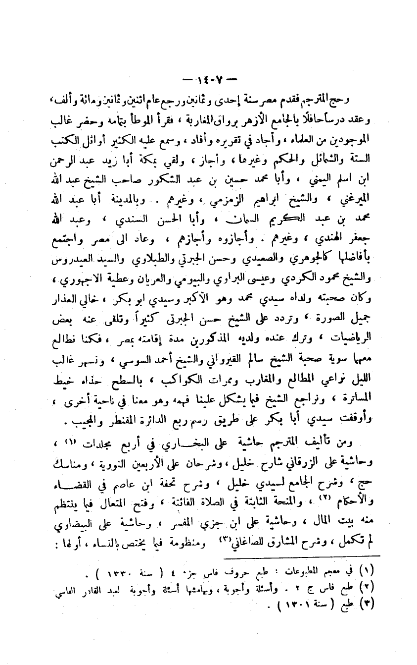 وحج المترجم فقدم مصر سنة إحدى وثمانين ورجع عام اثنين وثمانين ومائة وألف، وعقد درساً حافلاً بالجامع الأزهر برواق المغاربة، فقرأ الموطأ بتمامه وحضر غالب الموجودين من العلماء، وأجاد في تقريره وأفاد، وسمع عليه الكثير أوائل الكتب الستة والشمائل والحكم وغيرها، وأجاز، ولقي بمكة أبا زيد عبد الرحمن بن أسلم اليمني، وأبا محمد حسين بن عبد الشكور صاحب الشيخ عبد الله الميرغني، والشيخ إبراهيم الزمزمي، وغيرهم. وبالمدينة أبا عبد الله محمد بن عبد الكريم السمان، وأبا الحسن السندي، وعبد الله جعفر الهندي، وغيرهم. وأجازوه وأجازهم، وعاد إلى مصر واجتمع بأفاضلها كالجوهري والصعيدي وحسن الجبرتي والطبلاوي والسيد العيدروس والشيخ محمود الكردي وعيسى البراوي والبيومي والعريان وعطية الأجهوري، وكان صحبته ولداه سيدي محمد وهو الأكبر وسيدي أبو بكر، خالي العذار جميل الصورة، وتردد على الشيخ حسن الجبرتي كثيراً وتلقى عنه بعض الرياضيات، وترك عنده ولديه المذكورين مدة إقامته بمصر، فكنا نطالع معهما سوية صحبة الشيخ سالم القيرواني والشيخ أحمد السوسي، ونسعر غالب الليل نراعي المطالعه والمغارب وممرات الكواكب، بالسطح حذاء خيط المساترة، ونراجع الشيخ فيما يشكل علينا فهمه وهو معنا في ناحية أخرى، وأوقفت سيدي أبا بكر على طريق رسم ربع الدائرة المقنطر والمجيب.