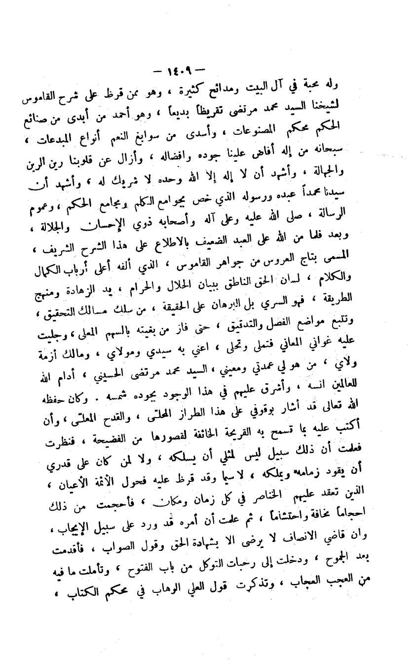 وله محبة في آل البيت ومدائح كثيرة، وهو ممن قرظ على شرح القاموس لشيخنا السيد محمد مرتضى تقريظاً بديعاً، وهو أحمد من أبدى من صنائع الحكم محكم المصنوعات، وأسدى من سوابغ النعم أنواع المبدعات، سبحانه من إله أفاض علينا جوده وإفضاله، وأزال عن قلوبنا رين الرين والجهالة، وأشهد أن لا إله إلا الله وحده لا شريك له، وأشهد أن سيدنا محمداً عبده ورسوله الذي خص بجوامع الكلم ومجامع الحكم، وعموم الرسالة، صلى الله عليه وعلى آله وأصحابه ذوي الإحسان والجلالة، وبعد فلما منّ الله على العبد الضعيف بالإطلاع على هذا الشرح الشريف، المسمى بتاج العروس من جواهر القاموس، الذي ألفه أعلى أرباب الكمال والكلام، لسان الحق الناطق ببيان الحلال والحرام، يد الزهادة ومنهج الطريقة، فهو السري بل البرهان على الحقيقة، من سلك مسالك التحقيق، وتتبع مواضع الفصل والتدقيق، حتى فاز من بغيته بالسهم المعلى، وجليت عليه غواني المعاني فتملى وتحلى، أعني به سيدي ومولاي، ومالك أزمة ولاي، من هو لي عمدتي ومعيني، السيد محمد مرتضى الحسيني، أدام الله للعالمين أنسه، وأشرق عليهم في هذا الوجود بجوده شمسه. وكان حفظه الله تعالى قد أشار بوقوفي على هذا الطراز المحلى، والقدح المعلى، وأن أكتب عليه بما تسمح به القريحة الخائفة لقصورها من الفضيحة، فنظرت فعلمت أن ذلك سبيل ليس لمثلي أن يسلكه، ولا لمن كان على قدري أن يقود زمامه ويملكه، لا سيما وقد قرظ عليه فحول الأئمة الأعيان، الذين تعقد عليهم الخناصر في كل زمان ومكان، فأحجمت من ذلك إحجاماً مخافة واحتشاماً، ثم علمت أن أمره قد ورد على سبيل الإيجاب، وإن قاضي الإنصاف لا يرضى إلا بشهادة الحق وقول الصواب، فأقدمت بعد الجموح، ودخلت إلى رحبات التوكل من باب الفتوح، وتأملت ما فيه من العجب العجاب، وتذكرت قول العلي الوهاب في محكم الكتاب "