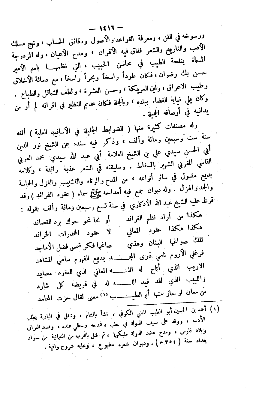 ورسوخه في الفن، ومعرفة القواعد والأصول ودقائق الحساب، ونهج مسلك الأدب والتاريخ والشعر ففاق فيه الأقران، ومدح الأعيان، وله المزدوجة المسماة بنفحة الطيب في محاسن الحبيب، التي نظمها باسم الأمير حسن بك رضوان، فكان طوداً راسخاً وبحراً راسخاً، مع دماثة الأخلاق وطيب الأعراق، ولين العريكة، وحسن العشرة، ولطف الشمائل والطباع. وكان يلي نيابة القضاء ببلده، وبالجملة فكان عديم النظير في أقرانه لم أر من يدانيه في أوصافه الجميلة.