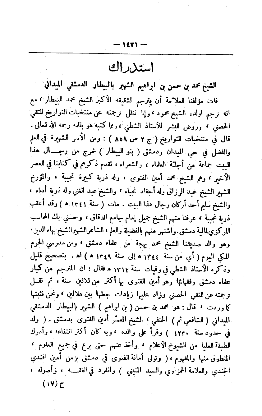 الشيخ محمد بن حسن بن إبراهيم الشهير بالبيطار الدمشقي الميداني