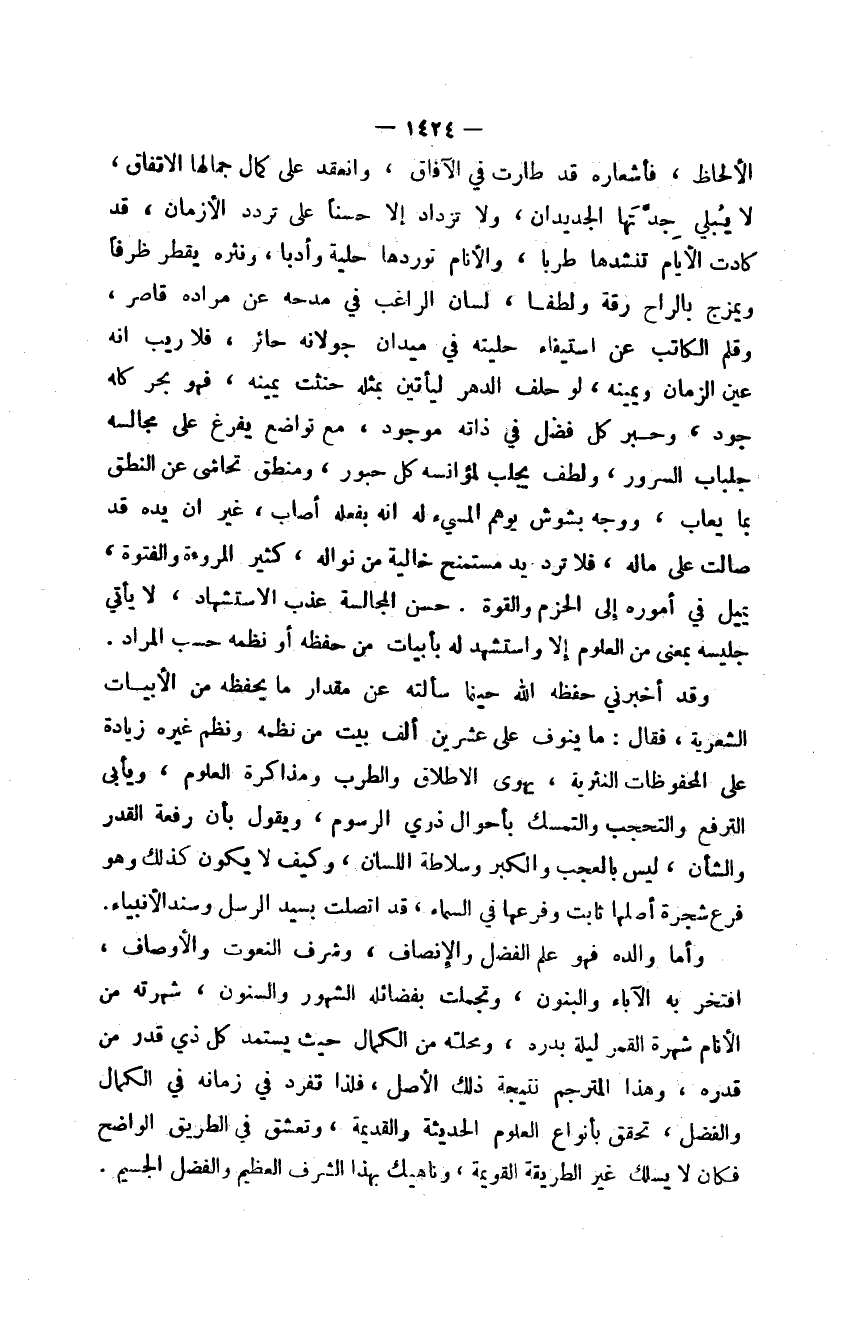 الألحاظ، فأشعاره قد طارت في الآفاق، وانعقد على كمال جمالها الاتفاق، لا يبلي جدتها الجديدان، ولا تزداد إلا حسناً على تردد الأزمان، قد كادت الأيام تنشدها طرباً، والأنام توردها حلية وأدبا، ونثره يقطر ظرفاً ويمزج بالراح رقة ولطفا، لسان الراغب في مدحه عن مراده قاصر، وقلم الكاتب عن استيفاء حليته في ميدان جولانه حائر، فلا ريب أنه عين الزمان ويمينه، لو حلف الدهر ليأتين بمثله حنثت يمينه، فهو بحر كله جود، وحبر كل فضل في ذاته موجود، مع تواضع يفرغ على مجالسه جلباب السرور، ولطف يجلب لمؤانسه كل حبور، ومنطق تحاشى عن النطق بما يعاب، ووجه بشوش يوهم المسيء له أنه بفعله أصاب، غير أن يده قد صالت على ماله، فلا ترد يد مستمنح خالبة من نواله، كثير المروءة والفتوة، يميل في أموره إلى الحزم والقوة. حسن المجالسة عذب الاستشهاد، لا يأتي جليسه بمعنى من العلوم إلا واستشهد له بأبيات من حفظه أو نظمه حسب المراد.