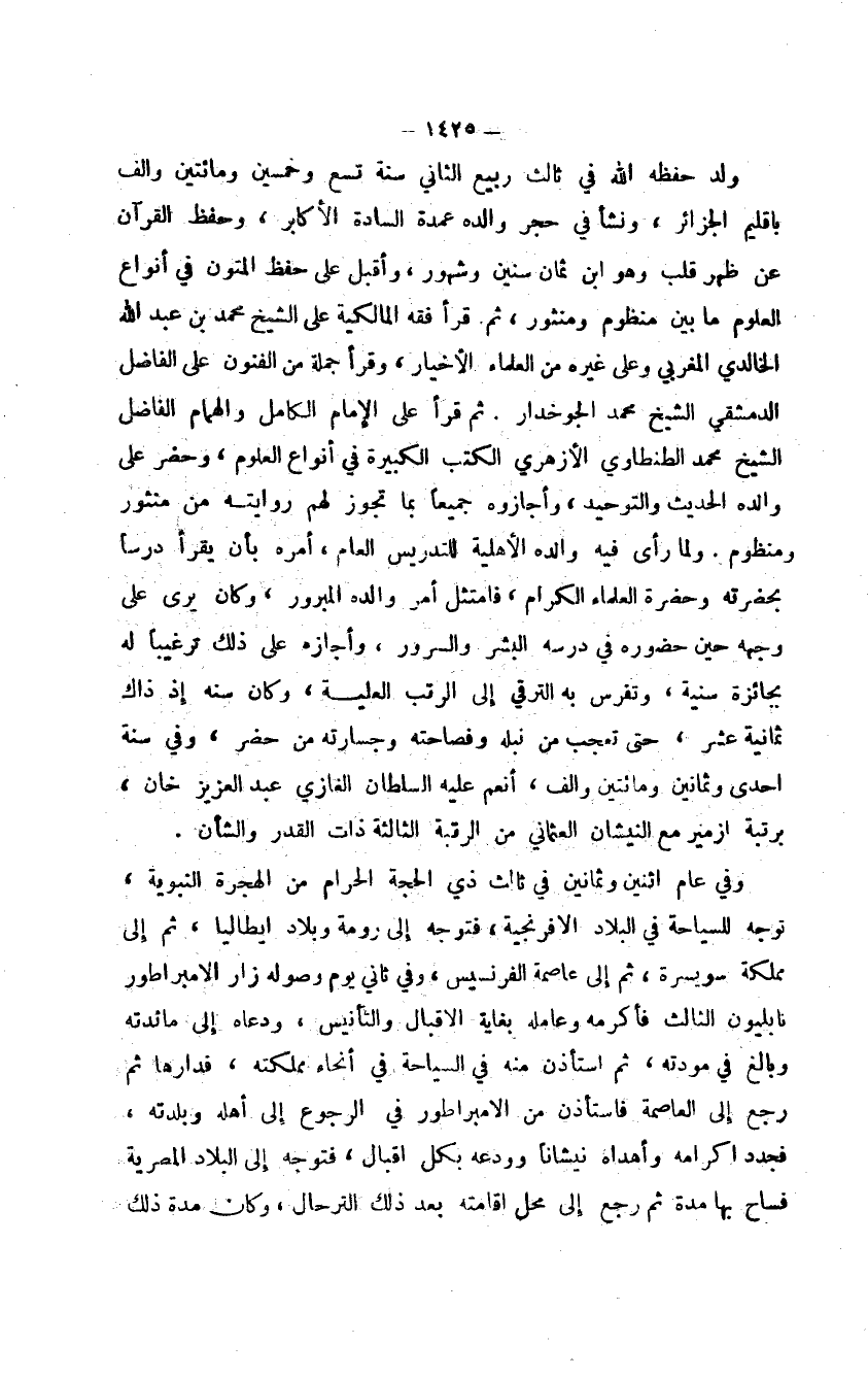 ولد حفظه الله في ثالث ربيع الثاني سنة تسع وخمسين ومائتين وألف بإقليم الجزائر، ونشأ في حجر والده عمدة السادة الأكابر، وحفظ القرآن عن ظهر قلب وهو ابن ثمان سنين وشهور، وأقبل على حفظ المتون في أنواع العلوم ما بين منظوم ومنثور، ثم قرأ فقه المالكية على الشيخ محمد بن عبد الله الخالدي المغربي وعلى غيره من العلماء الأخبار، وقرأ جملة من الفنون على الفاضل الدمشقي الشيخ محمد الجوخدار. ثم قرأ على الإمام الكامل والهمام الفاضل الشيخ محمد الطنطاوي الزهري الكتب الكبيرة في أنواع العلوم، وحضر على والده الحديث والتوحيد، وأجازوه جميعاً بما تجوز لهم روايته من منثور ومنظوم. ولما رأى فيه والده الأهلية للتدريس العام، أمره بأن يقرأ درساً بحضرته وحضرة العلماء الكرام، فامتثل أمر والده المبرور، وكان يرى على وجهه حين حضوره في درسه البشر والسرور، وأجازه على ذلك ترغيباً له بجائزة سنية، وتفرس به الترقي إلى الرتب العلية، وكان سنه إذ ذاك ثمانية عشر، حتى تعجب من نبله وفصاحته وجسارته من حضر، وفي سنة إحدى وثمانين ومائتين وألف، أنعم عليه السلطان الغازي عبد العزيز خان، برتبة ازمير مع النيشان العثماني من الرتبة الثالثة ذات القدر والشأن.