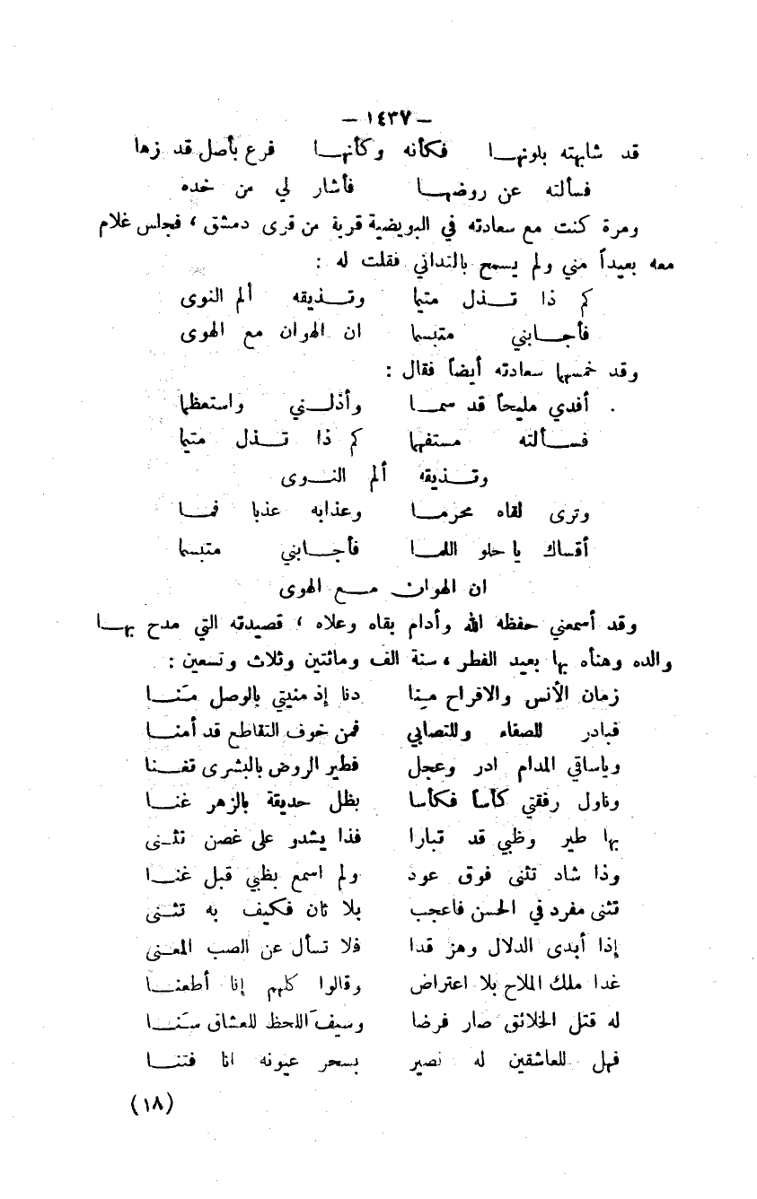 وقد أسمعني حفظه الله وأدام بقاه وعلاه، قصيدته التي مدح بها والده وهنأه بها بعيد الفطر، سنة ألف ومائتين وثلاث وتسعين: