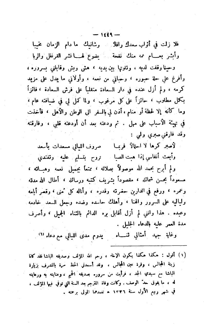 ولم أبرح بحمد الله موصولاً بصلاته، ممتعاً بجميل نعمه وهباته، مسعوداً بحسن شمائله، مقصوداً بشريف كتبه ورسائله، أطال الله مدته وعمره، ورفع في الدارين حضرته وقدره، وأناله كل منى، وقصر أيامه ولياليه على السرور والهنا، وأهلك حاسده وضده وجعل السعد خادمه وعبده. هذا وإنني لم أزل أقابل بره الدائم بالثناء الجميل، وأصرف مدة العمر عليه بالدعاء الجليل.