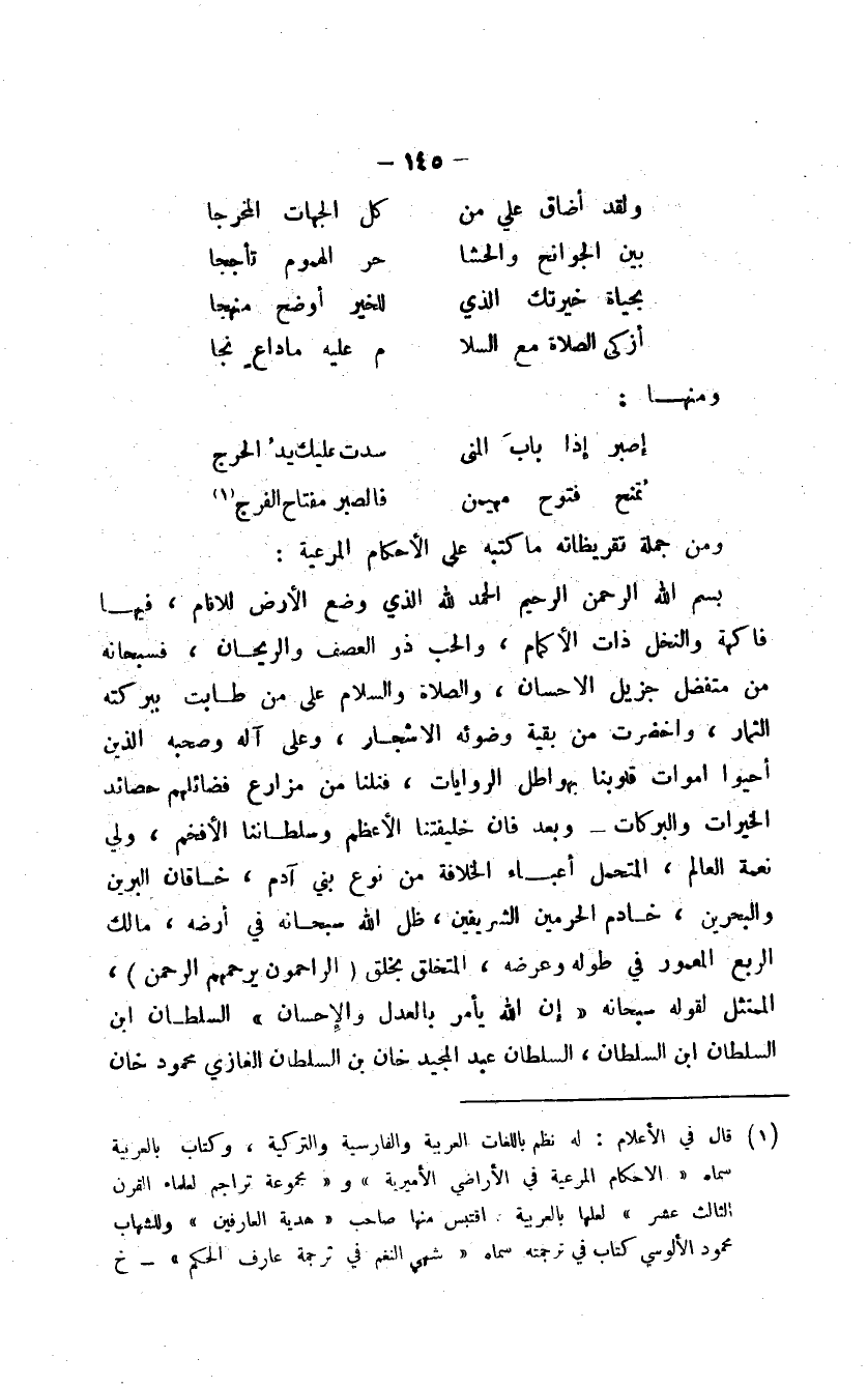بسم الله الرحمن الرحيم الحمد لله الذي وضع الأرض للأنام، فيها فاكهة والنخل ذات الأكمام، والحب ذو العصف والريحان، فسبحانه من متفضل جزيل الإحسان، والصلاة والسلام على من طابت ببركته الثمار، واخضرت من بقية وضوئه الأشجار، وعلى آله وصحبه الذين أحيوا أموات قلوبنا بهواطل الروايات، فنلنا من مزارع فضائلهم حصائد الخيرات والبركات وبعد فإن خليفتنا الأعظم وسلطاننا الأفخم، ولي نعمة العالم، المتحمل أعباء الخلافة من نوع بني آدم، خاقان البرين والبحرين، خادم الحرمين الشريفين، ظل الله سبحانه في أرضه، مالك الربع المعمور في طوله وعرضه، المتخلق بخلق الراحمون يرحمهم الرحمن، المتمثل لقوله سبحانه " إن الله يأمر بالعدل والإحسان " السلطان ابن السلطان ابن السلطان، السلطان عبد المجيد خان بن السلطان الغازي محمود خان