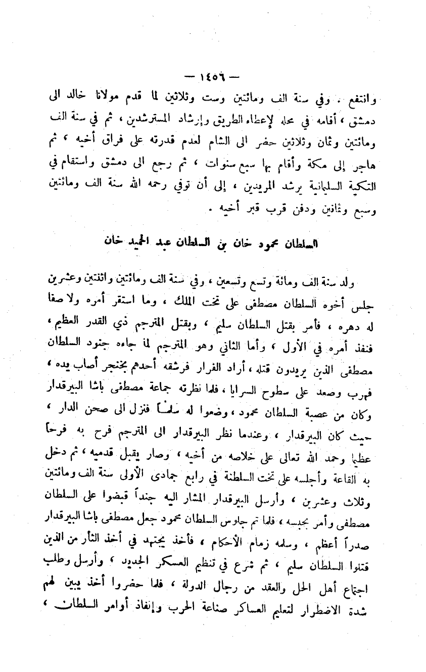 ولد سنة ألف ومائة وتسع وتسعين، وفي سنة ألف ومائتين واثنتين وعشرين جلس أخوه السلطان مصطفى على تخت الملك، وما استقر أمره ولا صفا له دهره، فأمر بقتل السلطان سليم، وبقتل المترجم ذي القدر العظيم، فنفذ أمره في الأول، وأما الثاني وهو المترجم لما جاءه جنود السلكان مصطفى الذين يريدون قتله، أراد الفرار فرشقه أحدهم بخنجر أصاب يده، فهرب وصعد على سطوح السرايا، فلما نظرته جماعة مصطفى باشا البيرقدار وكان من عصبة السلطان محمود، وضعوا له سلماً فنزل إلى صحن الدار، حيث كان البيرقدار، وعندما نظر البيرقدار إلى المترجم فرح به فرحاً عظيماً وحمد الله تعالى على خلاصه من أخيه، وصار يقبل قدميه، ثم دخل به القاعة وأجلسه على تخت السلطنة في رابع جمادى الأولى سنة ألف ومائتين وثلاث وعشرين، وأرسل البيرقدار المشار إليه جنداً قبضوا على السلطان مصطفى وأمر بحبسه، فلما تم جلوس السلطان محمود جعل مصطفى باشا البيرقدار صدراً أعظم، وسلمه زمام الأحكام، فأخذ يجتهد في أخذ الثأر من الذين قتلوا السلطان سليم، ثم شرع في تنظيم العسكر الجديد، وأرسل وطلب اجتماع أهل الحل والعقد من رجال الدولة، فلما حضروا أخذ يبين لهم شدة الاضطرار لتعليم العساكر صناعة الحرب وإنفاذ أوامر السلطان،