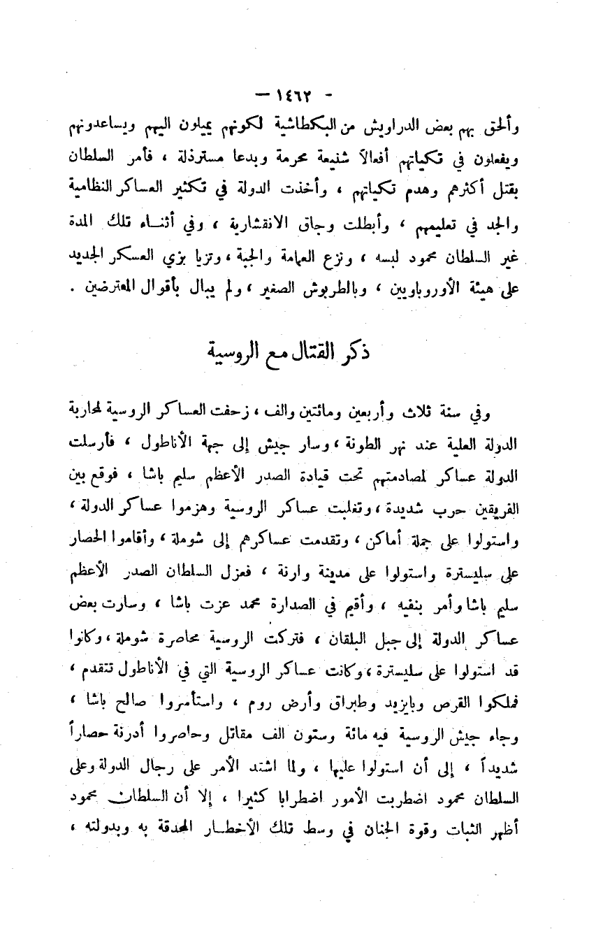 وألحق بهم بعض الدروايش من البكطاشية لكونهم يميلون إليهم ويساعدونهم ويفعلون في تكياتهم أفعالاً شنيعة محرمة وبدعا مسترذلة، فأمر السلطان بقتل أكثرهم وهدم تكياتهم، وأخذت الدولة في تكثير العساكر النظامية والجد في تعليمهم، وأبطلت وجاق الانقشارية، وفي أثناء تلك المدة غير السلطان محمود لبسه، ونزع العمامة والجبة، وتزيا بزي العسكر الجديد على هيئة الأوروباويين، وبالطربوش الصغير، ولم يبال بأقوال المعترضين.