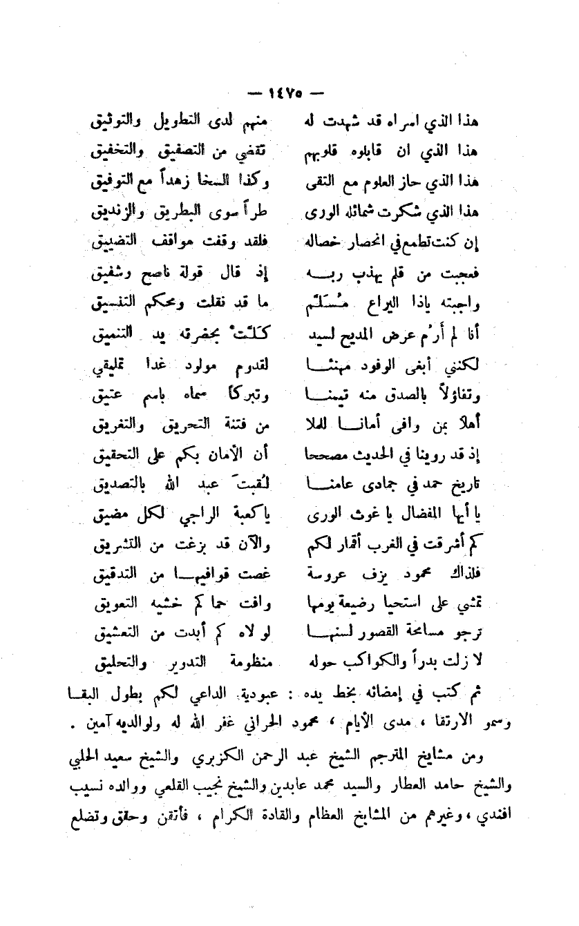 ثم كتب في إمضائه بخط يده: عبودية الداعي لكم بطول البقا وسمو الارتقا، مدى الأيام، محمود الحراني غفر الله له ولوالديه آمين.