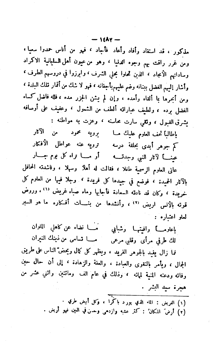 مذكور، قد استفاد وأفاد وأعاد فأجاد، فهو من أناس حمدوا سعياً، ومن غرر راقت بهم وجوه الدنيا، وهو من عيون أهل السليمانية الأكراد وساداتهم الأمجاد، الذين تحلوا بحلي الشرف، وأبرزوا في دروسهم الطرف، وأشار إليهم الفضل ببنانه وضم عليهم بأجفانه، فهو لا شك من أقمار تلك البلدة، ومن أبحرها بما ألقاه وأمده، وإن لم يشن الجزر مده، فلله فاضل كساه الفضل برده، ولطيف عباراته ألطف من الشمول، وعفيف على أوصافه يشرق القبول، وتقي سارت محاسنه، وعزت به مواطنه: