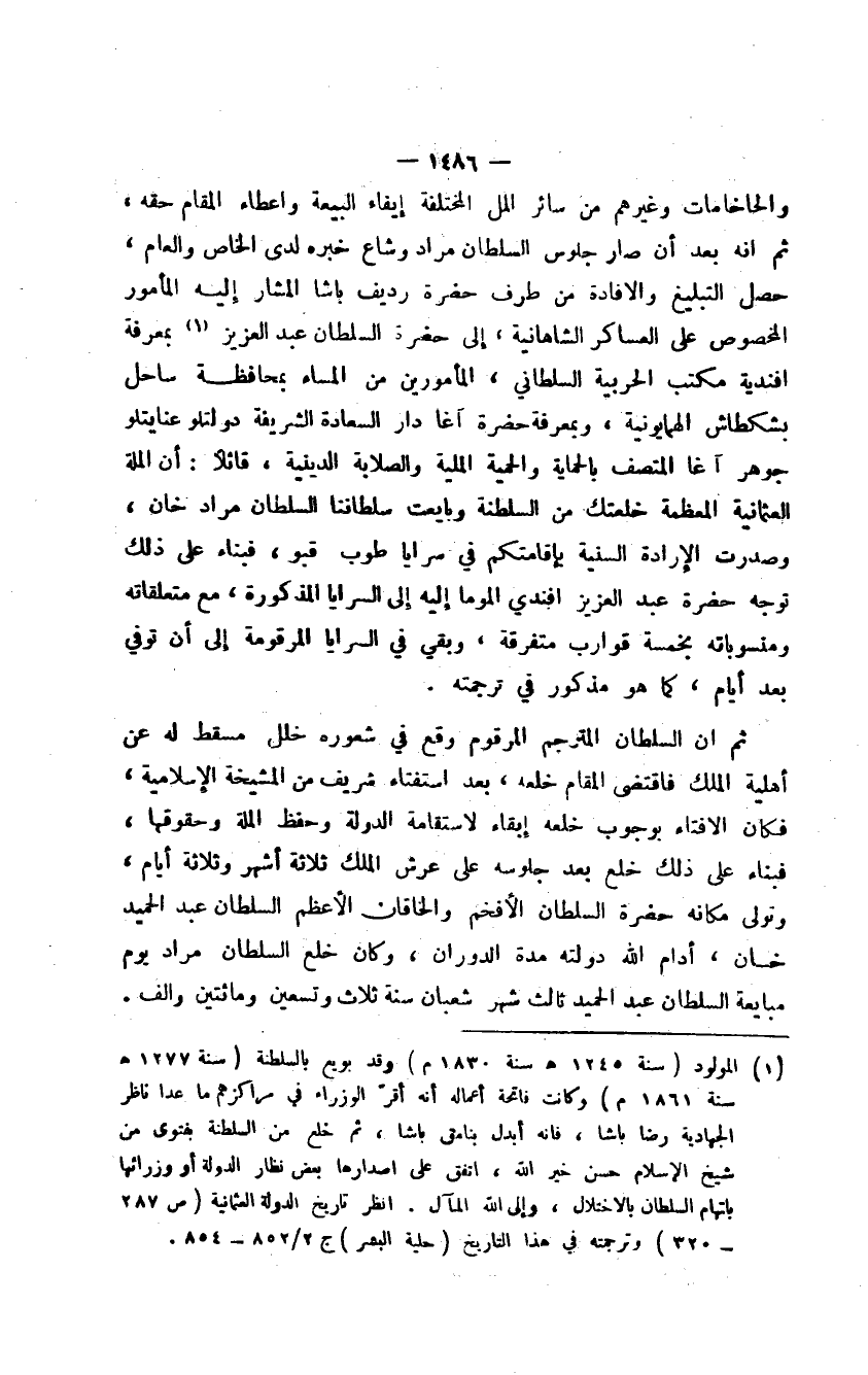 والحاخامات وغيرهم من سائر الملل المختلفة إيفاء البيعة وإعطاء المقام حقه، ثم إنه بعد أن صار جلوس السلطان مراد وشاع خبره لدى الخاص والعام، حصل التبليغ والإفادة من طرف حضرة رديف باشا المشار إليه المأمور المخصوص على العساكر الشاهانية، إلى حضرة السلطان عبد العزيز بمعرفة أفندية مكتب الحربية السلطاني، المأمورين من المساء بمحافظة ساحل بشكطاش الهمايونية، وبمعرفة حضرة آغا دار السعادة الشريفة دولتلو عنايتلو جوهر آغا المتصف بالحماية والحمية الملية والصلابة الدينية، قائلاً: أن الملة العثمانية المعظمة خلعتك من السلطنة وبايعت سلطاننا السلطان مراد خان، وصدرت الإرادة السنية بإقامتكم في سرايا طوب قبو، فبناء على ذلك توجه حضرة عبد العزيز أفندي الموما إليه إلى السرايا المذكورة، مع متعلقاته ومنسوباته بخمسة قوارب متفرقة، وبقي في السرايا المرقومة إلى أن توفي بعد أيام، كما هو مذكور في ترجمته.