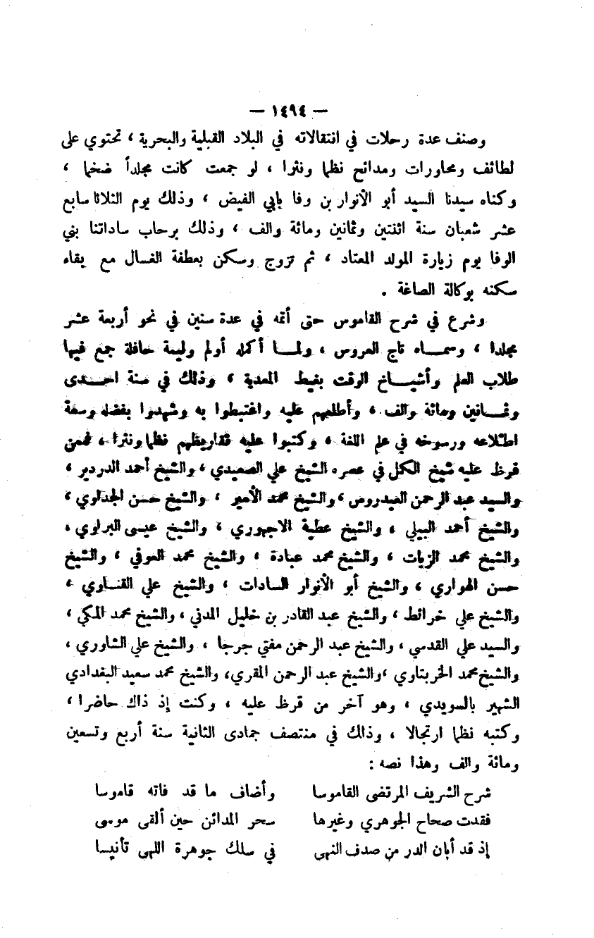 وصنف عدة رحلات في انتقالاته في البلاد القبلية والبحرية، تحتوي على لطائف ومحاورات ومدائح نظماً ونثراً، لو جمعت كانت مجلداً ضخماً، وكناه سيدنا السيد أبو الأنوار بن وفا بأبي الفيض، وذلك يوم الثلاثاء سابع عشر شعبان سنة اثنتين وثمانين ومائة وألف، وذلك برحاب ساداتنا بني الوفا يوم زيارة المولد المعتاد، ثم تزوج وسكن بعطفة الغسال مع بقاء سكنة بوكالة الصاغة.