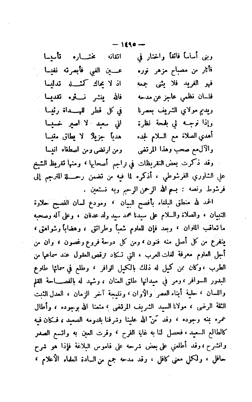 الحمد لله منطق البلغاء بأفصح البيان، ومودع لسان الفصيح حلاوة التبيان، والصلاة والسلام على سيدنا محمد سيد ولد عدنان، وعلى آله وصحبه ما تعاقب الملوان، وبعد فإن للعلوم شعباً وطرائق، وهضاباً وشواهق، يتفرع من كل أصل منه فنون، ومن كل دوحة فروع وغصون، وإن من أجل العلوم معرفة لغات العرب، التي تكاد ترقص العقول عند سماعها من الطرب، وكان ممن كيل له ذلك بالكيل الوافر، وطلع في سمائها طلوع البدور السوافر، ومر في ميدانها طلق العنان، وشهد له بالفصاحة القلم واللسان، حلية أبناء العصر والأوان، ونتيجة آخر الزمان، العدل الثبت الثقة الرضى، مولانا السيد الشريف المرتضى، متعنا الله بوجوده، وأطال عمره بمنه وجوده، وقد من الله علينا وشرفنا بقدومه الصعيد، فكان فيه كالطالع السعيد، فحصل لنا به غاية الفرح، وفرت العين به واتسع الصدر وانشرح، وقد أطلعني على بعض شرحه على قاموس البلاغة فإذا هو شرح حافل، ولكل معنى كافل، وقد مدحه جمع من السادة العلماء الأعلام،