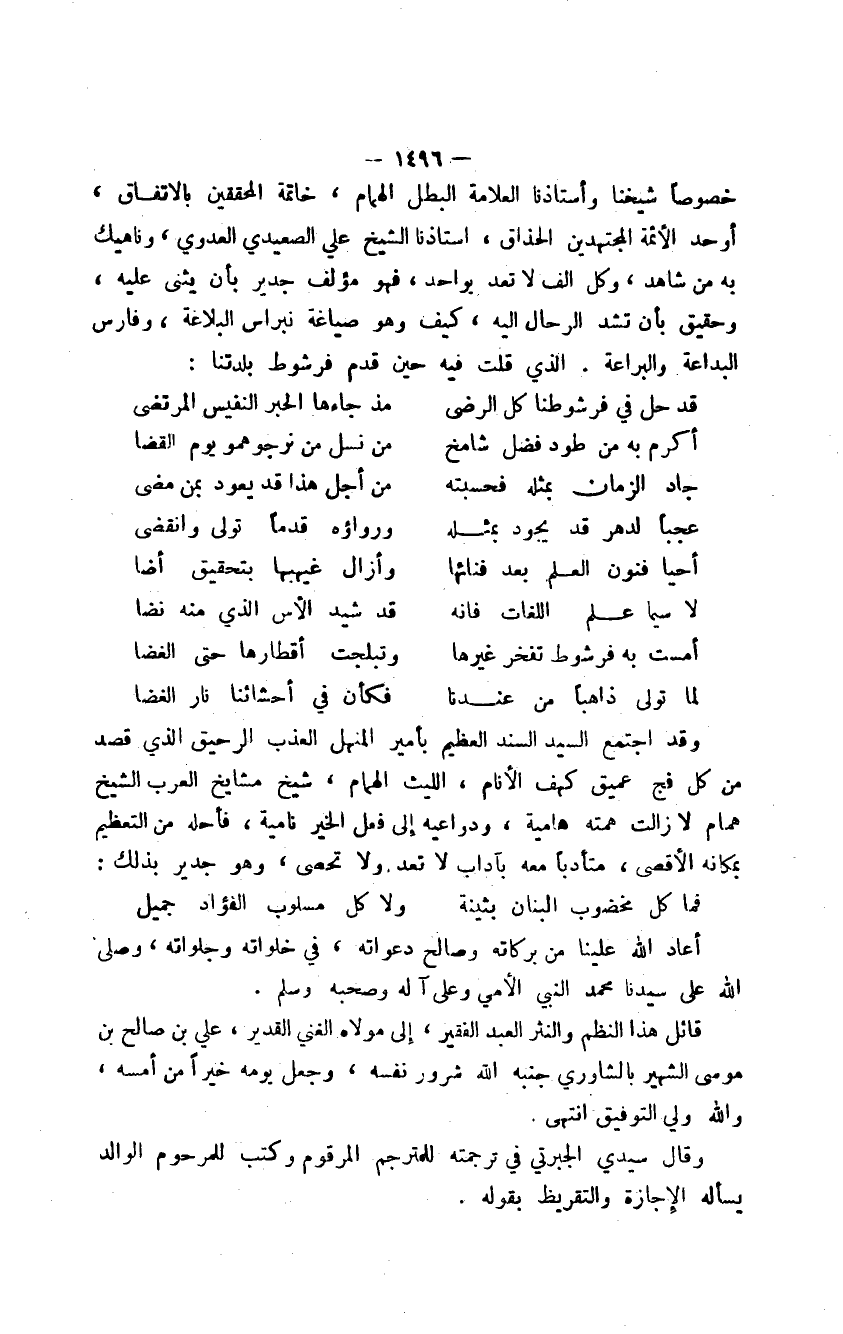 خصوصاً شيخنا وأستاذنا العلامة البطل الهمام، خاتمة المحققين بالاتفاق، أوحد الأئمة المجتهدين الحذاق، أستاذنا الشيخ علي الصعيدي العدوي، وناهيك به من شاهد، وكل ألف لا تعد بواحد، فهو مؤلف جدير بأن يثنى عليه، وحقيق بأن تشد الرحال إليه، كيف وهو صياغة نبراس البلاغة، وفارس البداعة والبراعة. الذي قلت فيه حين قدم فرشوط بلدتنا: