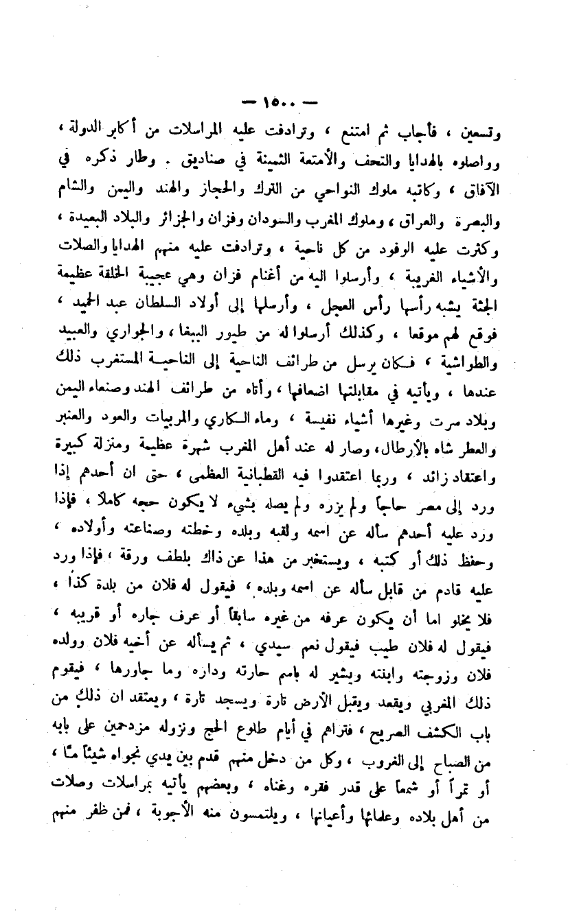 وتسعين، فأجاب ثم امتنع، وترادفت عليه المراسلات من أكابر الدولة، وواصلوه بالهدايا والتحف والأمتعة الثمينة في صناديق. وطار ذكره في الآفاق، وكاتبه ملوك النواحي من الترك والحجاز والهند واليمن والشام والبصرة والعراق، وملوك المغرب والسودان وفزان والجزائر والبلاد البعيدة، وكثرت عليه الوفود من كل ناحية، وترادفت عليه منهم الهدايا والصلات والأشياء الغريبة، وأرسلوا إليه من أغنام فزان وهي عجيبة الخلقة عظيمة الجثة يشبه رأسها رأس العجل، وأرسلها إلى أولاد السلطان عبد الحميد، فوقع لهم موقعا، وكذلك أرسلوا له من طيور الببغا، والجواري والعبيد والطواشية، فكان يرسل من طرائف الناحية إلى الناحية المستغرب ذلك عندها، ويأتيه في مقابلتها أضعافها، وأتاه من طرائف الهند وصنعاء اليمن وبلاد سرت وغيرها أشياء نفيسة، وماء الكاري والمربيات والعود والعنبر والعطر شاه بالأرطال، وصار له عند أهل المغرب شهرة عظيمة ومنزلة كبيرة واعتقاد زائد، وربما اعتقدوا فيه القطبانية العظمى، حتى أن أحدهم إذا ورد إلى مصر حاجاً ولم يزره ولم يصله بشيء لا يكون حجه كاملاً، فإذا ورد عليه أحدهم سأله عن اسمه ولقبه وبلده وخطته وصناعته وأولاده، وحفظ ذلك أو كتبه، ويستخبر من هذا عن ذاك بلطف ورقة، فإذا ورد عليه قادم من قابل سأله عن اسمه وبلده، فيقول له فلان من بلدة كذا، فلا يخلو إما أن يكون عرفه من غيره سابقاً أن عرف جاره أو قريبه، فيقول له فلان طيب فيقول نعم سيدي، ثم يسأله عن أخيه فلان وولده فلان وزوجته وابنته ويشير له باسم حارته وداره وما جاورها، فيقوم ذلك المغربي ويقعد ويقبل الأرض تارة ويسجد تارة، ويعتقد أن ذلك من باب الكشف الصريح، فتراهم في أيام طلوع الحج ونزوله مزدحمين على بابه من الصباح إلى الغروب، وكل من دخل منهم قدم بين يدي نجواه شيئاً ما، أو تمراً أو شمعاً على قدر فقره وغناه، وبعضهم يأتيه بمراسلات وصلات من أهل بلاده وعلمائها وأعيانها، ويلتمسون منه الأجوبة، فمن ظفر منهم