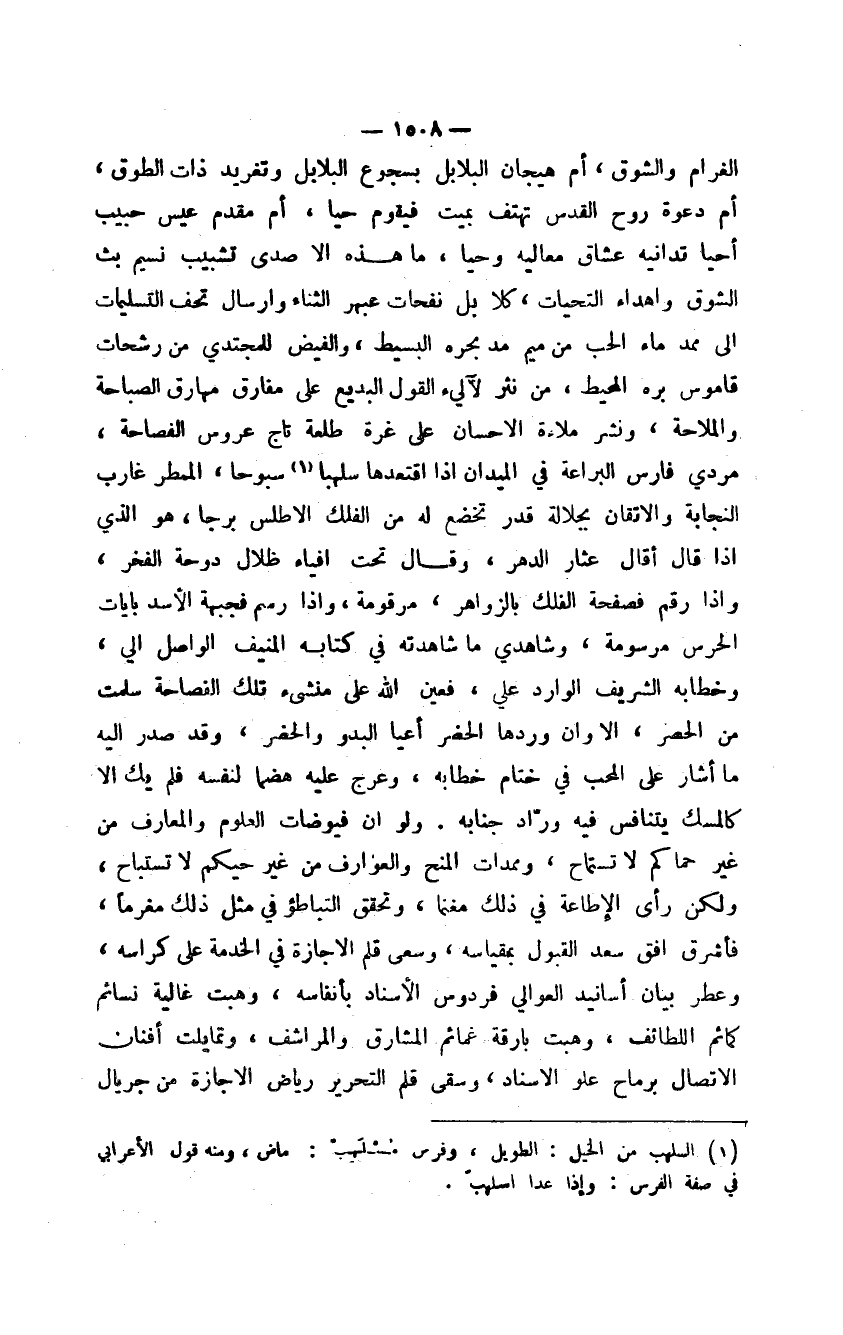 الغرام والشوق، أم هيجان البلابل بسجوع البلابل وتغريد ذات الطوق، أم دعوة روح القدس تهتف بميت فيقوم حيا، أم مقدم عيس حبيب أحيا تدانيه عشاق معاليه وحيا، ما هذه إلا صدى تشبيب نسيم بث الشوق وإهداء التحيات، كلا بل نفحات عبهر الثناء وإرسال تحف التسليمات إلى ممد ماء الحب من ميم مد بحره البسيط، والفيض للمجتدي من رشحات قاموس بره المحيط، من نثر لآليء القول البديع على مفارق مهارق الصباحة والملاحة، ونشر ملاءة الإحسان على غرة طلعة تاج عروس الفصاحة، مردي فارس البراعة في الميدان إذا اقتعدها سلهبا سبوحا، الممطر غارب النجابة والإتقان بجلالة قدر تخضع له من الفلك الأطلس برجا، هو الذي إذا قال أقال عثار الدهر، وقال تحت إفياء ظلال دوحة الفخر، وإذا رقم فصفحة الفلك بالزواهر، مرقومة، وإذا رسم فجبهة الأسد بايات الحرس موسومة، وشاهدي ما شاهدته في كتابه المنيف الواصل إلي، وخطابه الشريف الوارد علي، فعين الله على منشئ تلك الفصاحة سملت من الحصر، إلا وإن وردها الحضر أعيا البدو والحضر، وقد صدر إليه ما أشار على المحب في ختام خطابه، وعرج عليه هضماً لنفسه فلم يك إلا كالمسك يتنافس فيه وراد جنابه. ولو أن فيوضات العلوم والمعارف من غير حماكم لا تستماح، وممدات المنح والعوارف من غير حيكم لا تستباح، ولكن رأى الإطاعة في ذلك مغنما، وتحقق التباطؤ في مثل ذلك مغرماً، فأشرق أفق سعد القبول بمقياسه، وسعى قلم الإجازة في الخدمة على كراسه، وعطر بيان أسانيد العوالي فردوس الأسناد بأنفاسه، وهبت غالية نسائم كمائم اللطائف، وهبت بارقة غمائم المشارق والمراشف، وتمايلت أفنان الاتصال برماح علو الإسناد، وسقى قلم التحرير رياض الإجازة من جريال