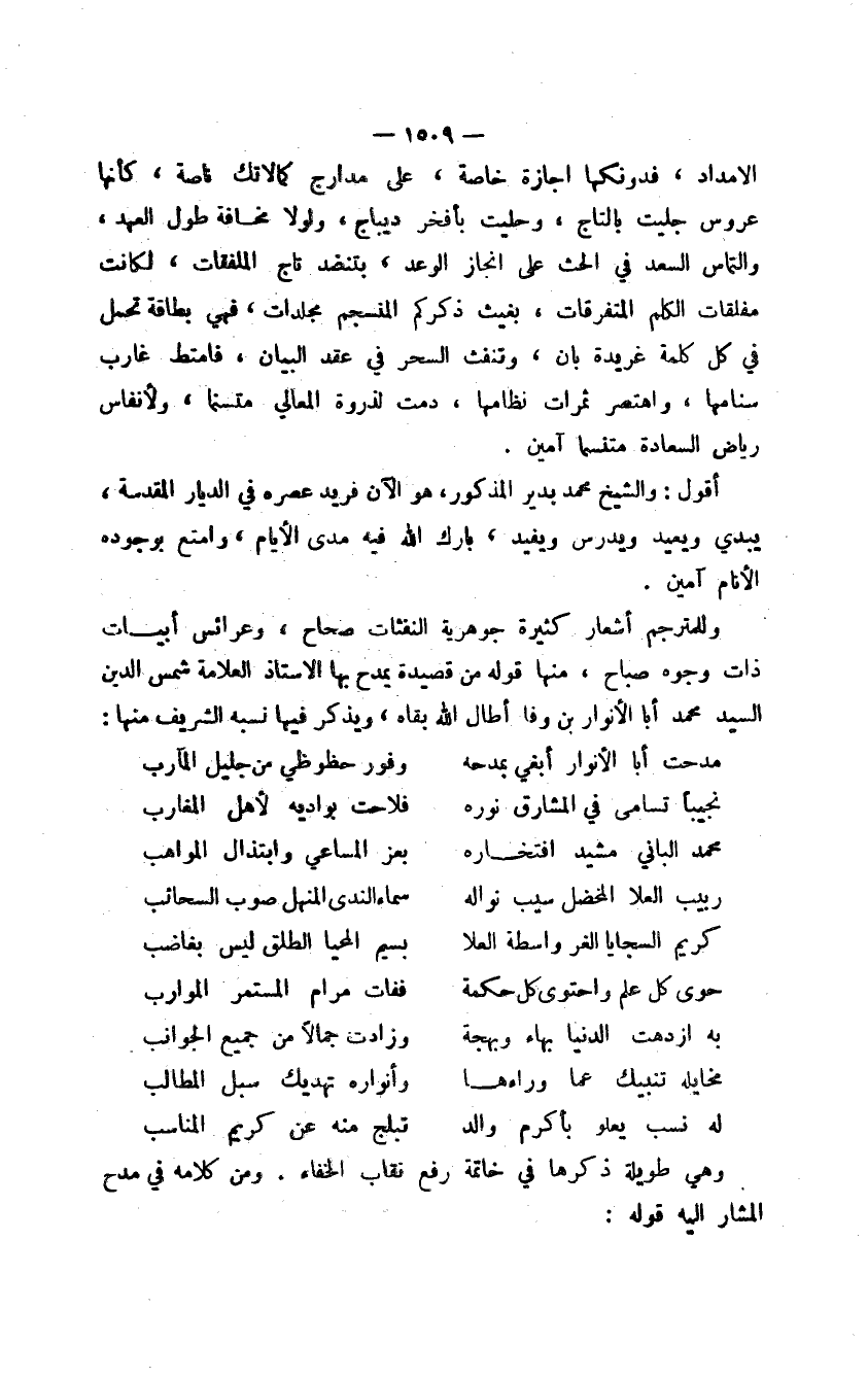 أقول: والشيخ محمد بدير المذكور، هو الآن فريد عصره في الديار المقدسة، يبدي ويعيد ويدرس ويفيد، بارك الله فيه مدى الأيام، وامتع بوجوده الأنام آمين.