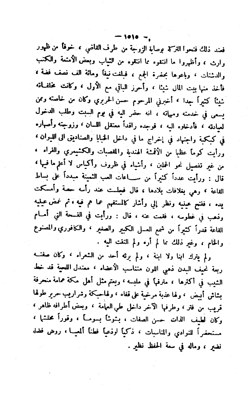 فعند ذلك فتحوا التركة بوصايا الزوجة من طرف القاضي، خوفاً من ظهور وارث، وأظهروا ما انتقوه مما انتقوه من الثياب وبعض الأمتعة والكتب والدشتات، وباعوها بحضرة الجمع، فبلغت نيفاً ومائة ألف نصف فضة، فأخذ منها بيت المال شيئاً، وأحرز الباقي مع الأول، وكانت مخلفاته شيئاً كثيراً جداً، أخبرني المرحوم حسن الحريري وكان من خاصته وممن يسعى في خدمته ومهماته، أنه حضر إليه في يوم السبت وطلب الدخول لعيادته، فأدخلوه إليه، فوجده راقداً معتقل اللسان، وزوجته وأصهاره في كبكبة واجتهاد في إخراج ما في داخل الخبايا والصناديق إلى الليوان، ورأيت كوماً عظيماً من الأقمشة الهندية والمقصبات والكشيمري والفراء، من غير تفصيل نحو الحملين، وأشياء في ظروف وأكياس لا أعلم ما فيها، قال: ورأيت عدداً كثيراً من ساعات العب الثمينة مبدداً على بساط القاعة، وهي بغلافات بلادها، قال فجلست عند رأسه حصة وأمسكت يده، ففتح عينيه ونظر إلي وأشار كالمستفهم عما هم فيه، ثم غمض عينيه وذهب في غطوسه، فقمت عنه، قال: ورأيت في الفسحة التي أمام القاعة قدراً كثيراً من شمع العسل الكبير والصغير، والكافوري والمصنوع والخام، وغير ذلك مما لم أره ولم ألتفت إليه.