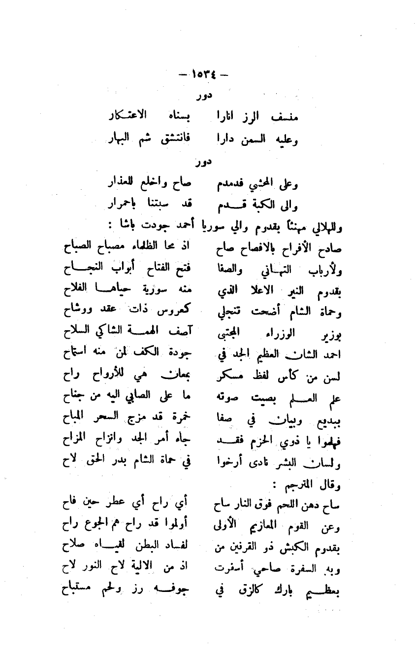 وللهلالي مهنئاً بقدوم والي سوريا أحمد جودت باشا: