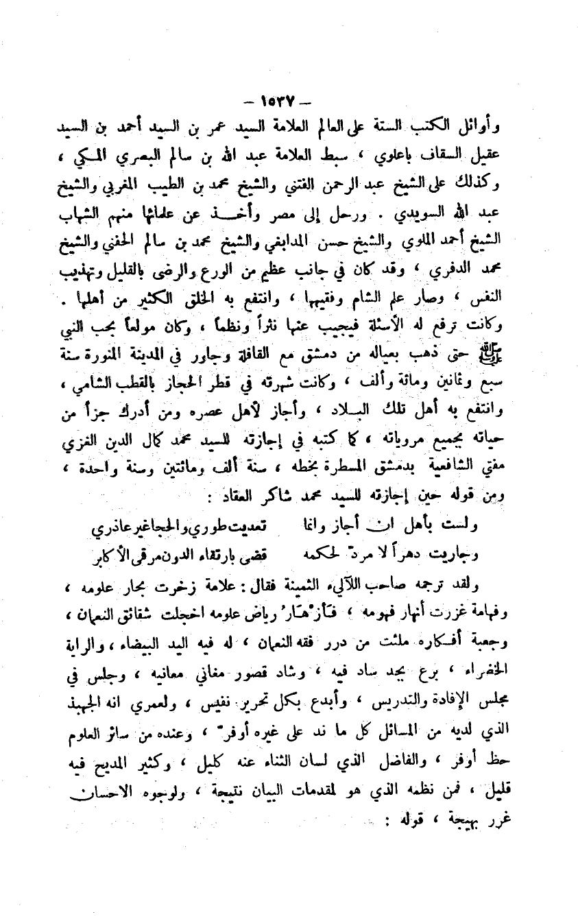 وأوائل الكتب الستة على العالم العلامة السيد عمر بن السيد أحمد بن السيد عقيل السقاف باعلوي، سبط العلامة عبد الله بن سالم البصري المكي، وكذلك على الشيخ عبد الرحمن الفتني والشيخ محمد بن الطيب المغربي والشيخ عبد الله السويدي. ورحل إلى مصر وأخذ عن علمائها منهم الشهاب الشيخ أحمد الملوي والشيخ حسن المدابغي والشيخ محمد بن سالم الحفني والشيخ محمد الدفري، وقد كان في جانب عظيم من الورع والرضى بالقليل وتهذيب النفس، وصار علم الشام وفقيهها، وانتفع به الخلق الكثير من أهلها. وكانت ترفع له الأسئلة فيجيب عنها نثراً ونظماً، وكان مولعاً بحب النبي صلى الله عليه وسلم حتى ذهب بعياله من دمشق مع القافلة وجاور في المدينة المنورة سنة سبع وثمانين ومائة وألف، وكانت شهرته في قطر الحجاز بالقطب الشامي، وانتفع به أهل تلك البلاد، وأجاز لأهل عصره ومن أدرك جزأ من حياته بجميع مروياته، كما كتبه في إجازته للسيد محمد كمال الدين الغزي مفتي الشافعية بدمشق المسطرة بخطه، سنة ألف ومائتين وسنة واحدة، ومن قوله حين إجازته للسيد محمد شاكر العقاد: