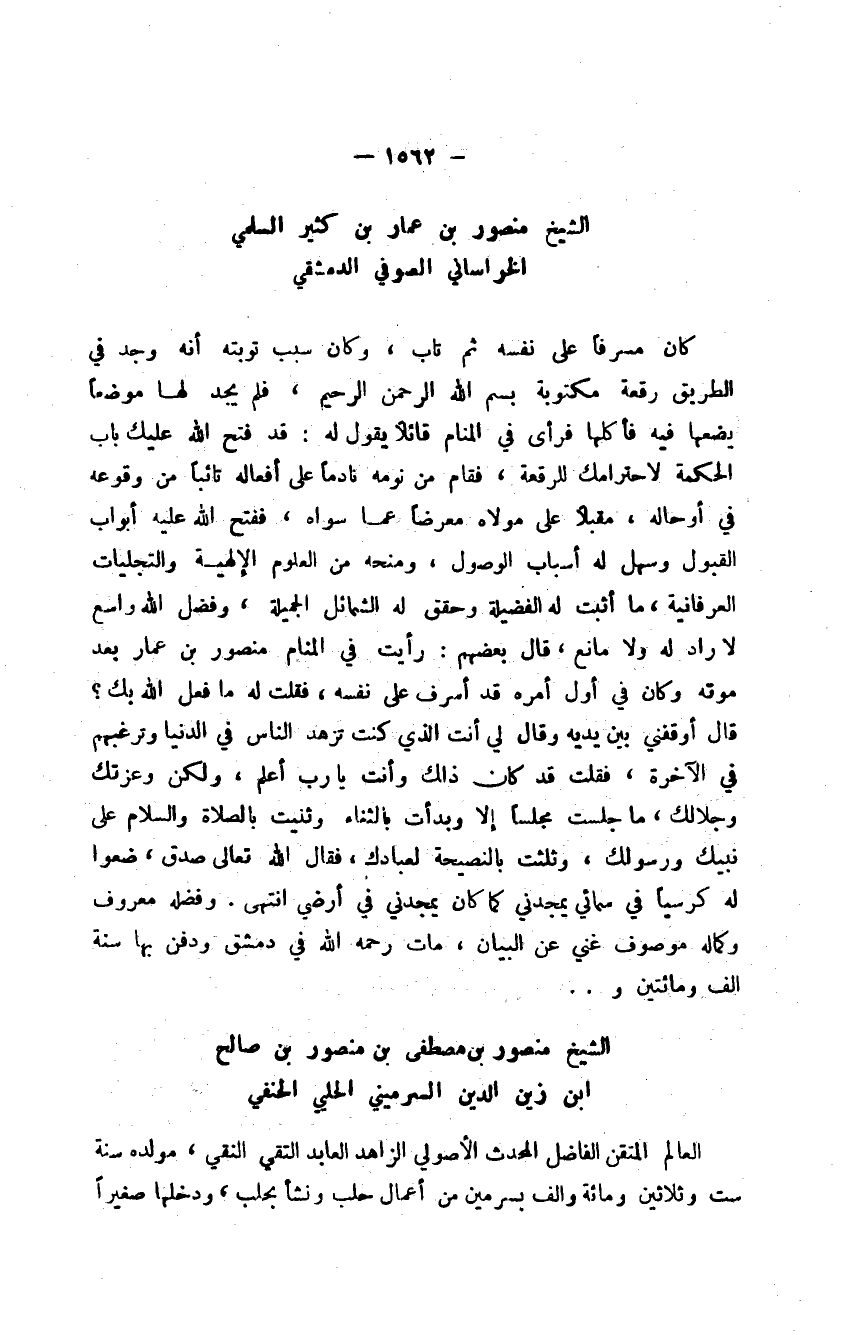 كان مسرفاً على نفسه ثم تاب، وكان سبب توبته أنه وجد في الطريق رقعة مكتوبة بسم الله الرحمن الرحيم، فلم يجد لها موضعاً يضعها فيه فأكلها فرأى في المنام قائلاً يقول له: قد فتح الله عليك باب الحكمة لاحترامك للرقعة، فقال من نومه نادماً على أفعاله تائباً من وقوعه في أوحاله، مقبلاً على مولاه معرضاً عما سواه، ففتح الله عليه أبواب القبول وسهل له أسباب الوصول، ومنحه من العلوم الإلهية والتجليات العرفانية، ما أثبت له الفضيلة وحقق له الشمائل الجميلة، وفضل الله واسع لا راد له ولا مانع، قال بعضهم: رأيت في المنام منصور بن عمار بعد موته وكان في أول أمره قد أسرف على نفسه، فقلت له ما فعل الله بك؟ قال أوقفني بي يديه وقال لي أنت الذي كنت تزهد الناس في الدنيا وترغبهم في الآخرة، فقلت قد كان ذلك وأنت يا رب أعلم، ولكن وعزتك وجلالك، ما جلست مجلساً إلا وبدأت بالثناء وثنيت بالصلاة والسلام على نبيك ورسولك، وثلثت بالنصيحة لعبادك، فقال الله تعالى صدق، ضعوا له كرسياً في سمائي يمجدني كما كان يمجدني في أرضي انتهى، وفضله معروف وكماله موصوف غني عن البيان، مات رحمه الله في دمشق ودفن بها سنة ألف ومائتين و....