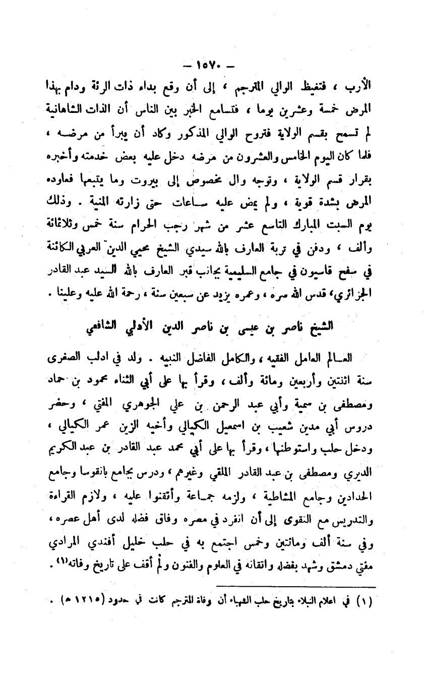 الأرب، فتغيظ الوالي المترجم، إلى أن وقع بداء ذات الرئة ودام بهذا المرض خمسة وعشرين يوماً، فتسامع الخبر بين الناس أن الذات الشاهانية لم تسمح بقسم الولاية فتروح الوالي المذكور وكاد أن يبرأ من مرضه، فلما كان اليوم الخامس والعشرون من مرضه دخل عليه بعض خدمته وأخبره بقرار قسم الولاية، وتوجه وال مخصوص إلى بيروت وما يتبعها فعاوده المرض بشدة قوية، ولم يمض عليه ساعات حتى زارته المنية، وذلك يوم السبت المبارك التاسع عشر من شهر رجب الحرام سنة خمس وثلاثمائة وألف، ودفن في تربة العارف الله سيدي الشيخ محيي الدين العربي الكائنة في سفح قاسيون في جامع السليمية بجانب قبر العارف بالله السيد عبد القادر الجزائري، قدس الله سره، وعمره يزيد عن سبعين سنة، رحمة الله عليه وعلينا.