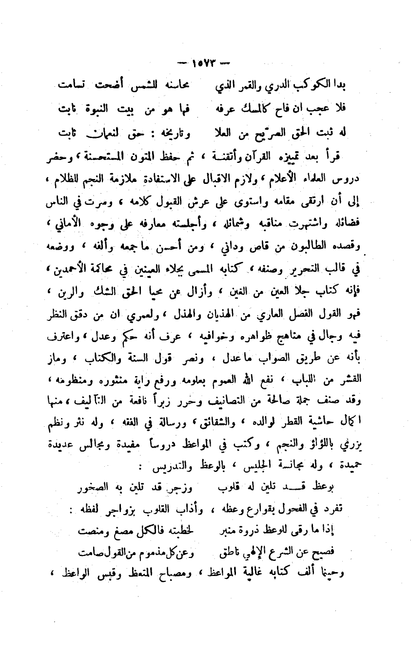 قرأ بعد تمييزه القرآن وأتقنه، ثم حفظ المتون المستحسنة، وحضر دروس العلماء الأعلام، ولازم الإقبال على الاستفادة ملازمة النجم للظلام، إلى أن ارتقى مقامه واستوى على عرش القبول كلامه، وسرت في الناس فضائله واشتهرت مناقبه وشمائله، وأجلسته معارفه على وجوه الأماني، وقصده الطالبون من قاص وداني، ومن أحسن ما جمعه وألفه، ووضعه في قالب التحرير وصنفه، كتابه المسمى بجلاء العينين في محاكمة الأحمدين، فإن كتاب جلا العين من الغين، وأزال عن محيا الحق الشك والرين، فهو القول الفصل العاري من الهذيان والهذل، ولعمري أن من دقق النظر فيه وجال في مناهج ظواهره وخوافيه، عرف أنه حكم وعدل، واعترف بأنه عن طريق الصواب ما عدل، ونصر قول السنة والكتاب، وماز القشر من اللباب، نفع الله العموم بعلومه ورفع راية منثوره ومنظومه، وقد صنف جملة صالحة من التصانيف وحرر زبراً نافعة من التآليف منها إكمال حاشية القطر لوالده، والشقائق، ورسالة في الفقه، وله نثر ونظم يزري باللؤلؤ النجم، وكتب في المواعظ دروساً مفيدة ومجالس عديدة حميدة، وله مجانسة الجليس، بالوعظ والتدريس: