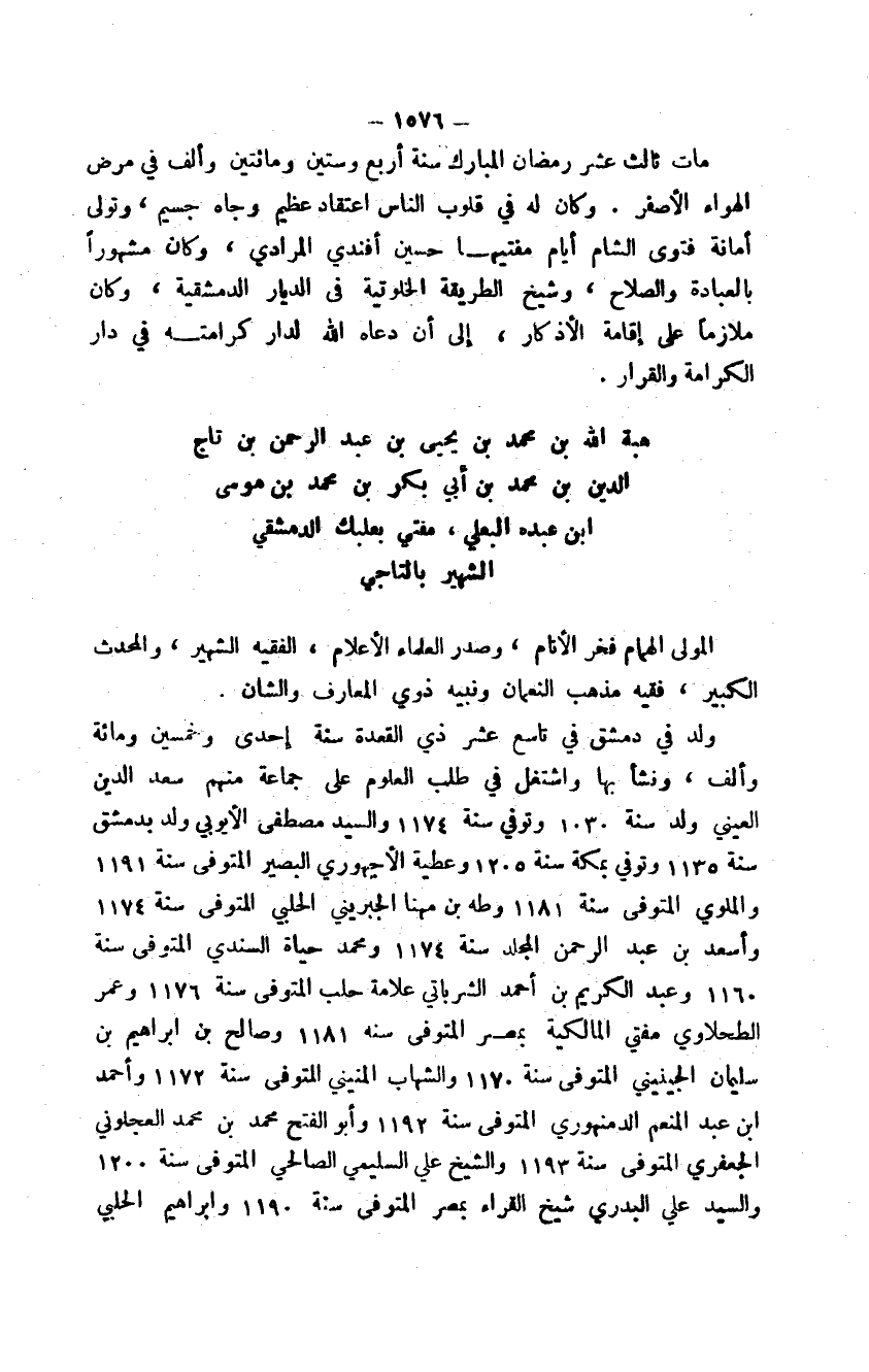 بن عبد الرحمن بن تاج الدين بن محمد بن أبي بكر بن محمد بن موسى ابن عبده البعلي، مفتي بعلبك الدمشقي الشهير بالتاجي المولى الهمام فخر الأنام، وصدر العلماء الأعلام، الفقيه الشهير، والمحدث الكبير، فقيه مذهب النعمان ونبيه ذوي المعارف والشان.