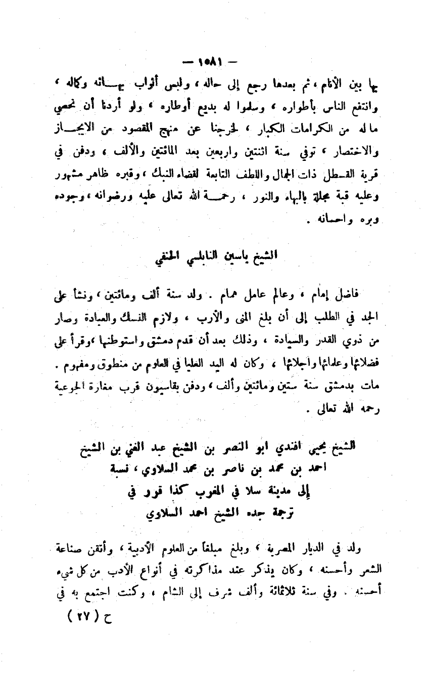 الشيخ ياسين النابلسي الحنفي فاضل إمام، وعالم عامل همام. ولد سنة ألف ومائتين، ونشأ على الجد في الطلب إلى أن بلغ المنى والأرب، ولازم النسك والعبادة وصار من ذوي القدر والسيادة، وذلك بعد أن قدم دمشق واستوطنها، وقرأ على فضلائها وعلمائها واجلائها، وكان له اليد العليا في العلوم من منطوق ومفهوم. مات بدمشق سنة ستين ومائتين وألف، ودفن بقاسيون قرب مغارة الجوعية رحمه الله تعالى.