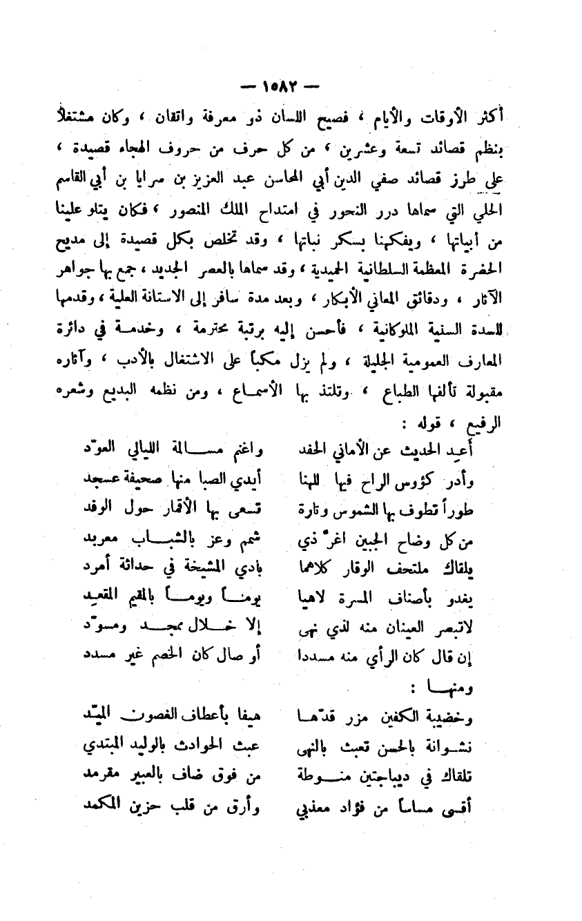 أكثر الأوقات والأيام، فصيح اللسان ذو معرفة وإتقان، وكان مشتغلاً بنظم قصائد تسعة وعشرين، من كل حرف من حروف الهجاء قصيدة، على طرز قصائد صفي الدين أبي المحاسن عبد العزيز بن سرايا بن أبي القاسم الحلي التي سماها درر النحور في امتداح الملك المنصور، فكان يتلو علينا من أبياتها، ويفكهنا بسكر نباتها، وقد تخلص بكل قصيدة إلى مديح الحضرة المعظمة السلطانية الحميدية، وقد سماها بالعصر الجديد، جمع بها جواهر الآثار، ودقائق المعاني الأبكار، وبعد مدة سافر إلى الأستانة العيلة، وقدمها للسدة السنية الملوكانية، فأحسن إليه برتبة محترمة، وخدمة في دائرة المعارف العمومية الجليلة، ولم يزل مكباً على الاشتغال بالأدب، وآثاره مقبولة تألفها الطباع، وتلتذ بها الأسماع، ومن نظمه البديع وشعره الرفيع، قوله: