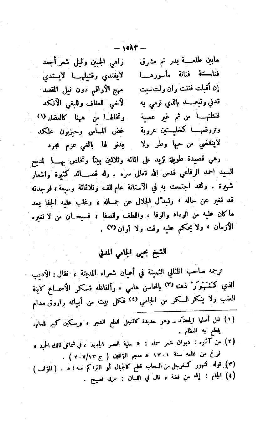 وهي قصيدة طويلة تزيد على المائة وثلاثين بيتاً وتخلص بها لمديح السيد أحمد الرفاعي قدس الله تعالى سره. وله قصائد كثيرة وأشعار شهيرة. ولقد اجتمعت به في الآستانة عام ألف وثلاثمائة وسبعة، فوجدته قد تغير عن حاله، وتبدل الجلال عن جماله، وغلب عليه الجفا بعد ما كان عليه من الوداد والوفا، واللطف والصفا، فسبحان من لا تغيره الأزمان، ولا يحكم عليه وقت ولا أوان.