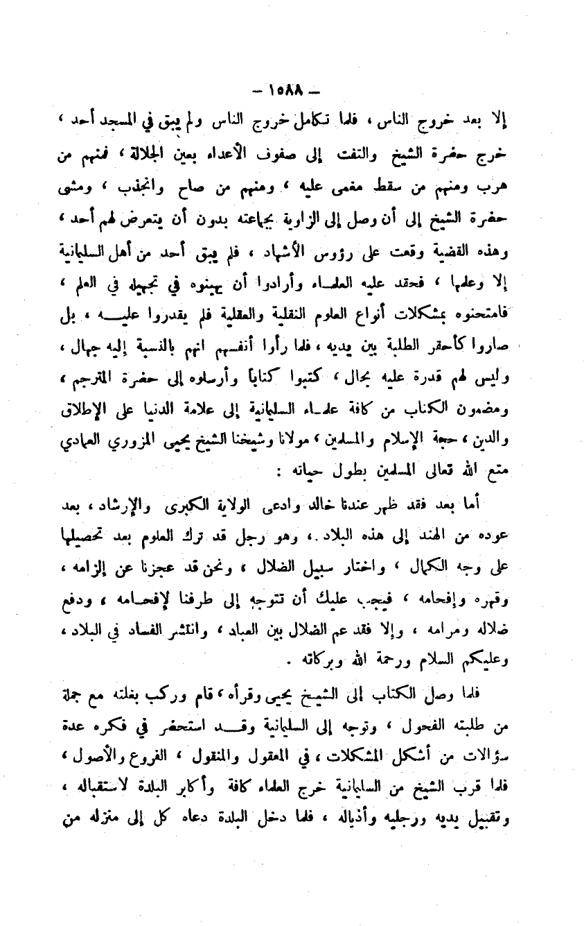 إلا بعد خروج الناس، فلما تكامل خروج الناس، ولم يبق في المسجد أحد، خرج حضرة الشيخ والتفت إلى صفوف الأعداء بعين الجلالة، فمنهم من هرب ومنهم من سقط مغمى عليه، ومنهم من صاح وانجذب، ومشى حضرة الشيخ إلى أن وصل إلى الزاوية بجماعته بدون أن يتعرض لهم أحد، وهذه القضية وقعت على رؤوس الأشهاد، فلم يبق أحد من أهل السليمانية إلا وعلمها، فحقد عليه العلماء وأرادوا أن يهينوه في تجهيله في العلم، فامتحنوه بمشكلات أنواع العلوم النقلية والعقلية فلم يقدروا عليه، بل صاروا كأحقر الطلبة بين يديه، فلما رأوا أنفسهم أنهم بالنسبة إليه جهال، وليس لهم قدرة عليه بحال، كتبوا كتاباً وأرسلوه إلى حضرة المترجم، ومضمون الكتاب من كافة علماء السليمانية إلى علامة الدنيا على الإطلاق والدين، حجة الإسلام والمسلمين، مولانا وشيخنا الشيخ يحيى المزوري العمادي متع الله تعالى المسلمين بطول حياته: أما بعد فقد ظهر عندنا خالد وادعى الولاية الكبرى والإرشاد، بعد عوده من الهند إلى هذه البلاد، وهو رجل قد ترك العلوم بعد تحصيلها على وجه الكمال، واختار سبيل الضلال، ونحن قد عجزنا إن إلزامه، وقهره وإفحامه، فيجب عليك أن تتوجه إلى طرفنا لإفحامه، ودفع ضلاله ومرامه، وإلا فقد عم الضلال بين العباد، وانتشر الفساد في البلاد، وعليكم السلام ورحمة الله وبركاته.