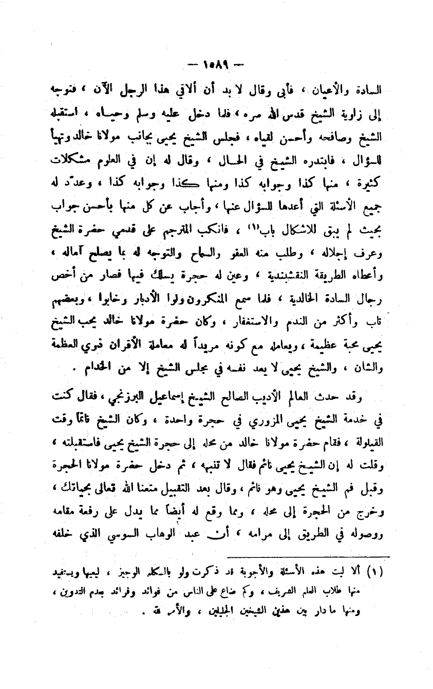 السادة الأعيان، فأبى وقال لا بد أن ألاقي هذا الرجل الآن، فتوجه إلى زاوية الشيخ قدس الله سره، فلما دخل عليه وسلم وحياه، استقبله الشيخ وصافحه وأحسن لقياه، فجلس الشيخ يحيى بجانب مولانا خالد وتهيأ للسؤال، فابتدره الشيخ في الحال، وقال له إن في العلوم مشكلات كثيرة، منها كذا وجوابه كذا ومنها كذا وجوابه كذا، وعدد له جميع الأسئلة التي أعدها للسؤال عنها، وأجاب عن كل منها بأحسن جواب بحيث لم يبق للإشكال باب، فانكب المترجم على قدمي حضرة الشيخ وعرف إجلاله، وطلب منه العفو والسماح والتوجه له بما يصلح آماله، وأعطاه الطريقة النقشبندية، وعين له حجرة يسلك فيها فصار من أخص رجال السادة الخالدية، فلما سمع المنكرون ولوا الأدبار وخابوا، وبعضهم تاب وأكثر من الندم والاستغفار، وكان حضرة مولانا خالد يحب الشيخ يحيى محبة عظيمة، ويعامله مع كونه مريداً له معاملة الأقران ذوي العظمة والشان، والشيخ يحيى لا يعد نفسه في مجلس الشيخ إلا من الخدام.