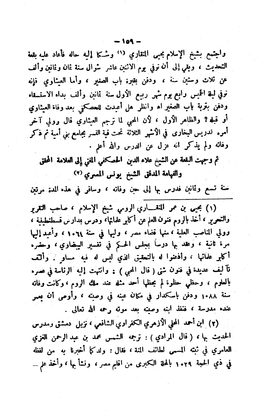واجتمع بشيخ الإسلام يحيى المنقاري وشكا إليه حاله فأعاد عليه بقعة التحديث، وبقي إلى أن توفي يوم الإثنين عاشر شوال سنة ثمان وثمانين وألف عن ثلاث وستين سنة، ودفن بمقبرة باب الصغير، وأما العيثاوي فإنه توفي ليلة الخميس رابع يوم شهر ربيع الأول سنة ثمانين وألف بداء الاستسقاء ودفن بتربة باب الصغير اه وانظر هل أعيدت للحصفكي بعد وفاة العيثاوي أو قبله؟ والظاهر الأول، لأن المحبي لما ترجم العيثاوي قال وولي آخر أمره تدريس البخاري في الأشهر الثلاثة تحت قبة النسر بجامع بني أمية ثم ذكر وفاته ولم يذكر أنه عزل عن الدرس والله أعلم.