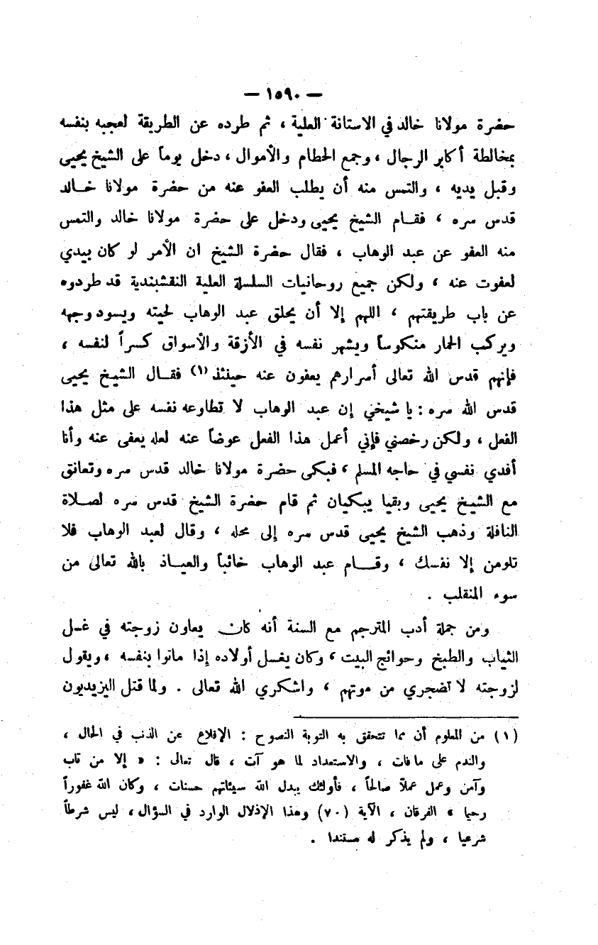 حضرة مولانا خالد في الأستانة العلية، ثم طرده عن الطريقة لعجبه بنفسه بمخالطة أكابر الرجال، وجمع الحطام والأموال، دخل يوماً على الشيخ يحيى وقبل يديه، والتمس منه أن يطلب العفو عنه من حضرة مولانا خالد قدس سره، فقام الشيخ يحيى ودخل على حضرة مولانا خالد والتمس منه العفو عن عبد الوهاب، فقال حضرة الشيخ أن الأمر لو كان بيدي لعفوت عنه، ولكن جميع روحانيات السلسلة العلية النقشبندية قد طردوه عن باب طريقتهم، اللهم إلا أن يحلق عبد الوهاب لحيته ويسود وجهه ويركب الحمار منكوساً ويشهر نفسه في الأزقة والأسواق كسراً لنفسه، فإنهم قدس الله تعالى أسرارهم يعفون عنه حينئذ فقال الشيخ يحيى قدس الله سره: يا شيخي إن عبد الوهاب لا تطاوعه نفسه على مثل هذا الفعل، ولكن رخصني فإني أعمل هذا الفعل عوضاً عنه لعله يعفى عنه وأنا أفدي نفسي في حاجة المسلم، فبكى حضرة مولانا خالد قدس الله سره وتعانق مع الشيخ يحيى وبقيا يبكيان ثم قام حضرة الشيخ قدس الله سره لصلاة النافلة وذهب الشيخ يحيى قدس الله سره إلى محله، وقال لعبد الوهاب فلا تلومن إلا نفسك، وقام عبد الوهاب خائباً والعياذ بالله تعالى من سوء المنقلب.