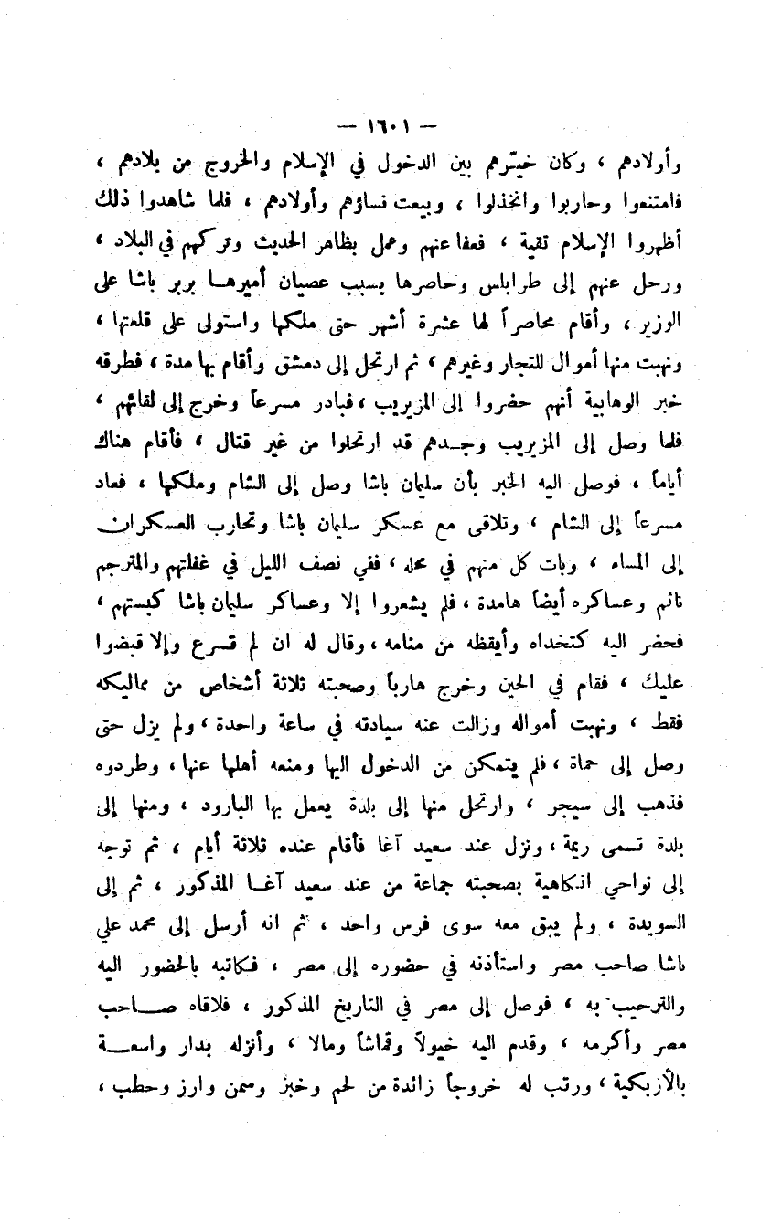 وأولادهم، وكان خيرهم بين الدخول في الإسلام والخروج من بلادهم، فامتنعوا وحاربوا وانخذلوا، وبيعت نساؤهم وأولادهم، فلما شاهدوا ذلك أظهروا الإسلام تقية، فعفا عنهم وعمل بظاهر الحديث وتركهم في البلاد، ورحل عنهم إلى طرابلس وحاصرها بسبب عصيان أميرها بربر باشا على الوزير، وأقام محاصراً لها عشرة أشهر حتى ملكها واستولى على قلعتها، ونهبت منها أموال للتجار وغيرهم، ثم ارتحل إلى دمشق وأقام بها مدة، فطرقه خبر الوهابية أنهم حضروا إلى المزيريب، فبادر مسرعاً وخرج إلى لقائهم، فلما وصل إلى المزيريب وجدهم قد ارتحلوا من غير قتال، فأقام هناك أياماً، فوصل إليه الخبر بأن سليمان باشا وصل إلى الشام وملكها، فعاد مسرعاً إلى الشام، وتلاقى مع عسكر سليمان باشا وتحارب العسكران إلى المساء، وبات كل منهم في محله، ففي نصف الليل في غفلتهم والمترجم نائم وعساكره أيضاً هامدة، فلم يشعروا إلا وعساكر سليمان باشا كبستهم، فحضر إليه كتخداه وأيقظه من منامه، وقال له إن لم تسرع وإلا قبضوا عليك، فقام في الحين وخرج