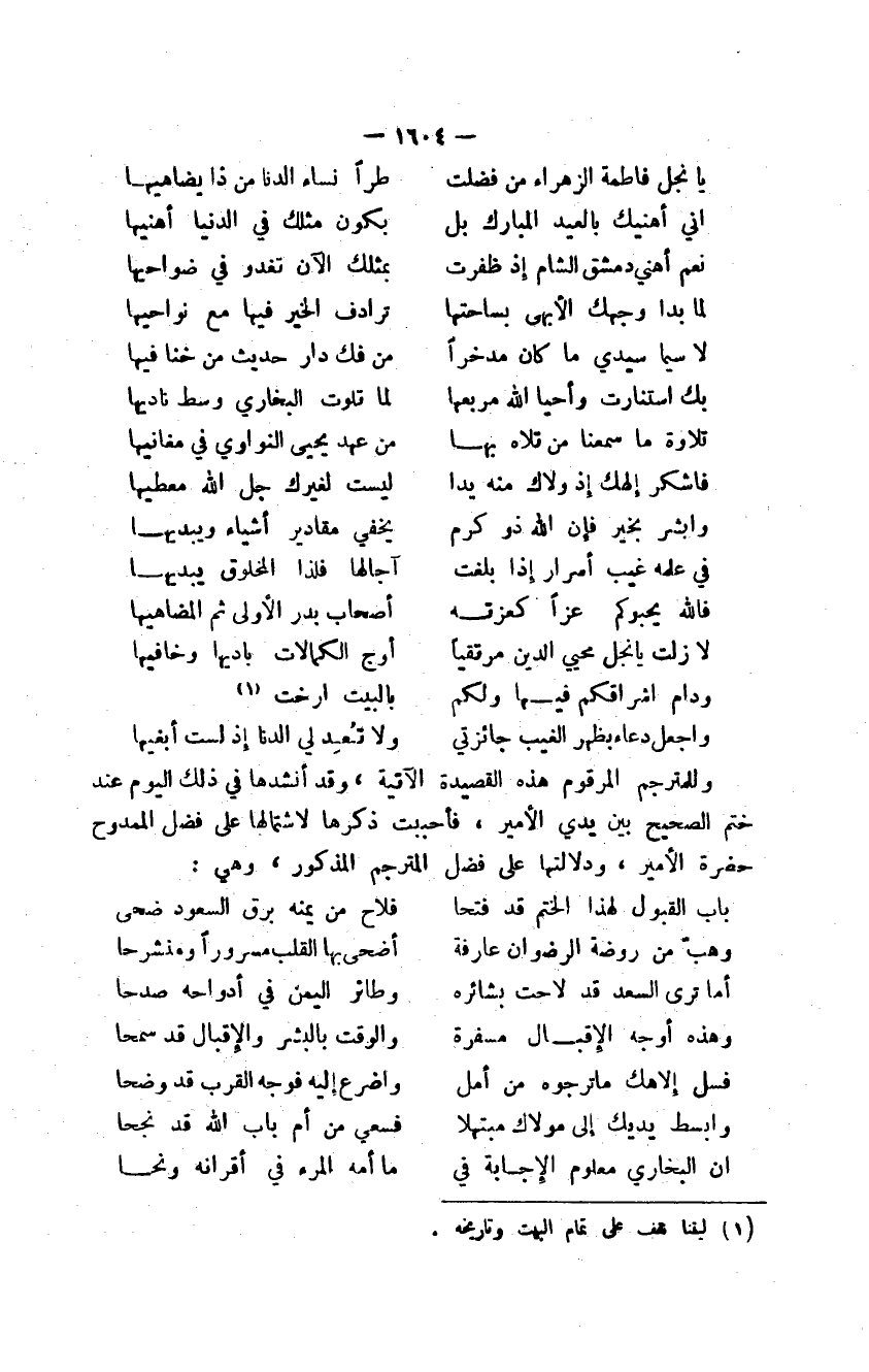 وللمترجم المرقوم هذه القصيدة الآتية، وقد أنشدها في ذلك اليوم عند ختم الصحيح بين يدي الأمير، فأحببت ذكرها لاشتمالها على فضل الممدوح حضرة الأمير، ودلالتها على فضل المترجم المذكور، وهي: