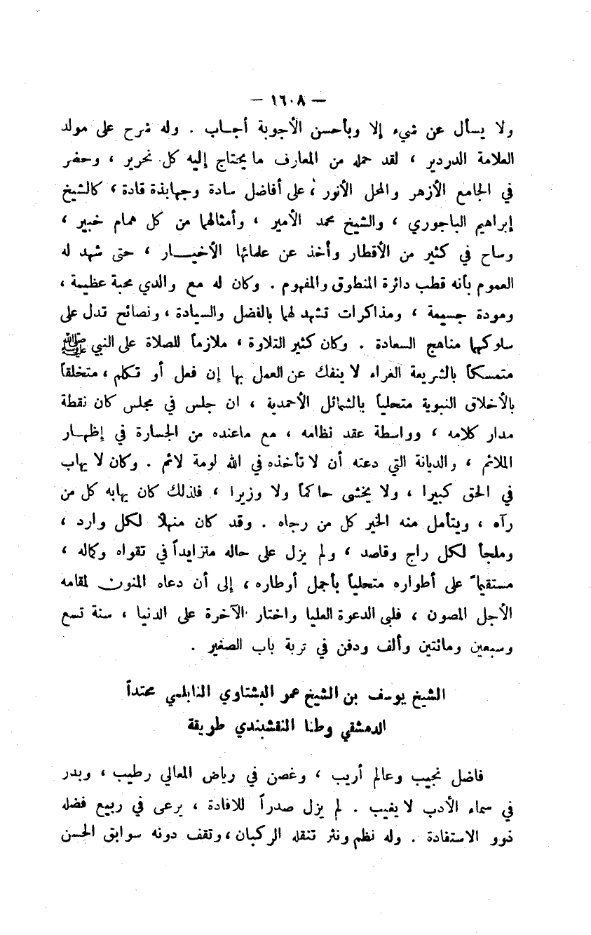 الشيخ يوسف بن الشيخ عمر البشتاوي النابلسي محتداً الدمشقي وطنا النقشبندي طريقة