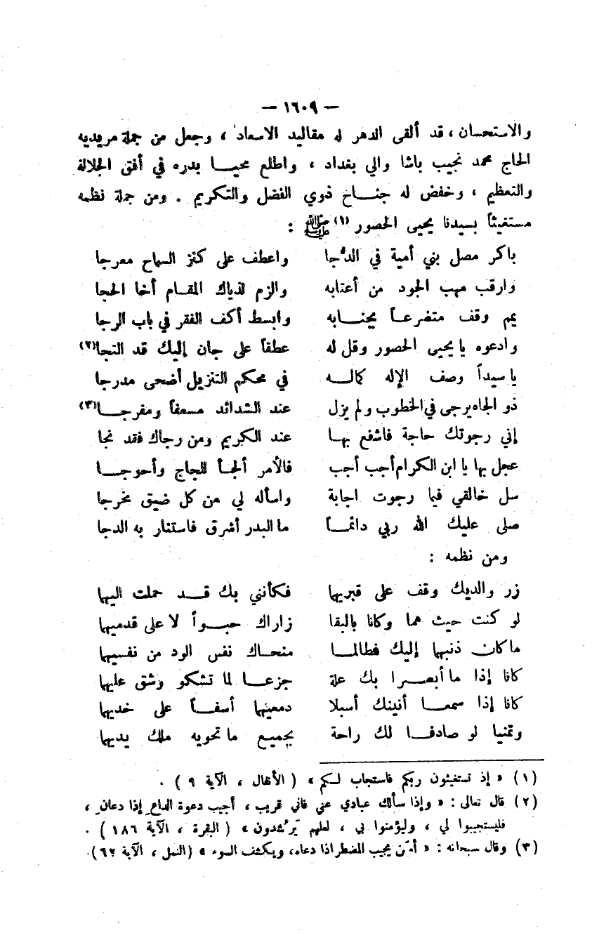 والاستحسان، قد ألقى الدهر له مقاليد الإسعاد، وجعل من جملة مريديه الحاج محمد نجيب باشا والي بغداد، واطلع محيا بدره في أفق الجلالة والتعظيم، وخفض له جناح ذوي الفضل والتكريم، ومن جملة نظمه مستغيثاً بسيدنا يحيى الحصور صلى الله عليه وسلم: