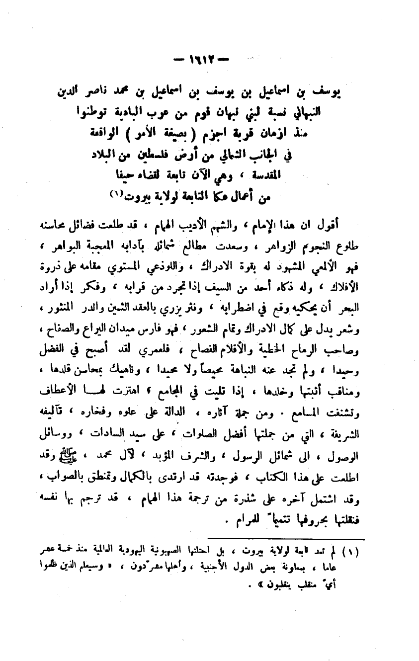 بن إسماعيل بن محمد ناصر الدين النبهاني نسبة لبني نبهان قوم من عرب البادية توطنوا منذ أزمان قرية أجزم بصيغة الأمر الواقعة في الجانب الشمالي من أرض فلسطين من البلاد المقدسة، وهي الآن تابعة لقضاء حيفا من أعمال عكا التابعة لولاية بيروت أقول أن هذا الإمام، والشهم الأديب الهمام، قد طلعت فضائل محاسنه طلوع النجوم الزواهر، وسعدت مطالع شمائله بآدابه المعجبة البواهر، فهو الألمعي المشهود له بقوة الإدراك، واللوذعي المستوي مقامه على ذروة الأفلاك، وله ذكاء أحد من السيف إذا تجرد من قرابه، وفكر إذا أراد البحر أن يحكيه وقع في اضطرابه، ونثر يزري بالعقد الثمين والدر المنثور، وشعر يدل على كمال الإدراك وتمام الشعور، فهو فارس ميدان اليراع والصفاح، وصاحب الرماح الخطية والأقلام الفصاح، فلعمري لقد أصبح في الفضل وحيداً، ولن تجد عنه النباهة محيصاً ولا محيدا، وناهيك بمحاسن قلدها، ومناقب أثبتها وخلدها، إذا تليت في المجامع، اهتزت لها الأعطاف وتشنفت المسامع. ومن جملة آثاره، الدالة على علوه وفخاره، تآليفه الشريفة، التي من جملتها أفضل الصلوات، على سيد السادات، ووسائل الوصول، إلى شمائل الرسول، والشرف المؤبد لآل محمد، صلى الله عليه وسلم وقد اطلعت على هذا الكتاب، فوجدته قد ارتدى بالكمال وتمنطق بالصواب، وقد اشتمل آخره على شذرة من ترجمة هذا الهمام، قد ترجم بها نفسه فنقلتها بحروفها تتميماً للمرام.