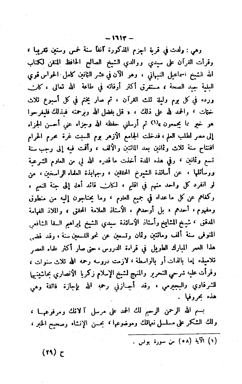 وهي: ولدت في قرية أجزم المذكورة آنفاً سنة خمس وستين تقريباً، وقرأت القرآن على سيدي ووالدي الشيخ الصالح الحافظ المتقن لكتاب الله الشيخ إسماعيل النبهاني، وهو الآن في عشر الثمانين كامل الحواس قوي البينة جيد الصحة، مستغرق أكثر أوقاته في طاعة الله تعالى، كان ورده في كل يوم وليلة ثلث القرآن، ثم صار يختم في كل أسبوع ثلاث ختمات، والحمد لله على ذلك، " قل بفضل وبرحمته فبذلك فليفرحوا هو خير مما يجمعون " ثم أرسلني حفظه الله وجزاه عني أحسن الجزاء إلى مصر لطلب العلم، فدخلت الجامع الأزهر يوم السبت غرة محرم الحرام افتتاح سنة ثلاث وثمانين بعد المائتين والألف، وأقمت فيه إلى رجب سنة تسع وثمانين، وفي هذه المدة أخذت ما قدره الله لي من العلوم الشرعية ووسائلها، عن أساتذة الشيوخ المحققين، وجهابذة العلماء الراسخين، من لو انفرد كل واحد منهم في إقليم، لكان قائد أهله إلى جنة النعيم، وكفاهم عن كل ما عداه في جميع العلوم، وما يحتاجون إليه من منطوق ومفهوم، أحدهم، بل أوحدهم، الأستاذ العلامة المحقق، والملاذ الفهامة المدقق، شيخ المشايخ وأستاذ الأساتذة سيدي الشيخ إبراهيم السقا الشافعي المتوفى سنة ألف ومائتين وثمان وتسعين عن نحو التسعين سنة، وقد قضى هذا العمر المبارك الطويل في قراءة الدروس، حتى صار أكثر علماء العصر تلاميذه إما بالذات أو بالواسطة، لازمت دروسه رحمه الله تعالى ثلاث سنوات، وقرأت عليه شرحي التحرير والمنهج لشيخ الإسلام زكريا الأنصاري بحاشيتهما للشرقاوي والبجيرمي، وقد أجازني رحمه الله تعالى بإجازة فائقة وهي هذه بحروفها.