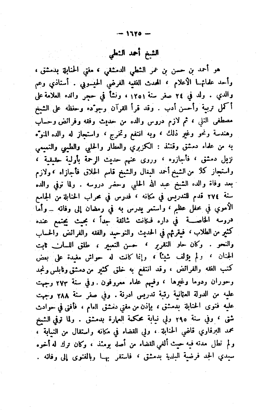 هو أحمد بن حسن بن عمر الشطي الدمشقي، مفتني الحنابلة بدمشق، وأحد علمائها الأعلام، المحدث الفقيه الفرضي الحيسوبي. أستاذي وعم والدي. ولد في 24 صفر سنة 1251، ونشأ في حجر والده العلامة على أكمل تربية وأحسن أدب. وقد قرأ القرآن وجوده وحفظه على الشيخ مصطفى التلي، ثم لازم دروس والده من حديث وفقه وفرائض وحساب وهندسة ونحو وغير ذلك، وبه انتفع وتخرج، واستجاز له والده المنوه به من علماء دمشق وقتئذ: الكزبري والعطار والحلبي والطيبي والتميمي نزيل دمشق، فأجازوه، وروى عنهم حديث الرحمة بأولية حقيقية، واستجاز كلاً من الشيخ أحمد البغال والشيخ قاسم الحلاق فأجازاه، ولازم بعد وفاة والده الشيخ عبد الله الحلبي وحضر دروسه. ولما توفي والده سنة 274 قدم للتدريس في مكانه، فدرس في محراب الحنابلة من الجامع الأموي في محفل عظيم، واستمر يدرس به في رمضان إلى وفاته - وأما دروسه الخاصة في داره فكانت شائقة جداً، بحيث يجتمع عنده كثير من الطلاب، فيقرئهم في الحديث والتوحيد والفقه والفرائض والحساب والنحو. وكان حلو التقرير، حسن التعبير، طلق اللسان ثابت الجنان، ولم يؤلف شيئاً، وإنما كانت له حواش مفيدة على بعض كتب الفقه والفرائض، وقد انتفع به خلق كثير من دمشق ونابلس ونجد وحوران ودوما وغيرها، وفيهم علماء معروفون. وفي سنة 273 وجهت عليه من الدولة العثمانية رتبة تدريس ادرنة. وفي صفر سنة 288 وجهت عليه فتوى الحنابلة لدمشق، بإذن من مفتي دمشق العام، فأفتى في حوادث شتى، وفي سنة 295 ولي نيابة محكمة العمارة بدمشق. ولما توفي الشيخ محمد البرقاوي قاضي الحنابلة، ولي القضاء في مكانه واستقال من النيابة، ولم تطل مدته فيه حيث ألغي القضاء من أصله يومئذ، وكان ترك له أخوه سيدي الجد فرضية البلدية بدمشق، فاستقر بها وبالفتوى إلى وفاته.