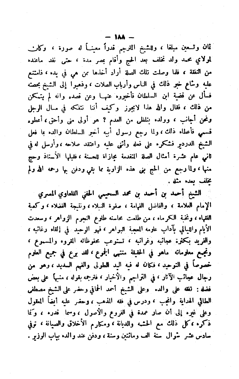 الإمام العلامة، والفاضل الفهامة، صفوة النبلاء، ونتيجة الفضلاء، وكعبة الفقهاء، ونخبة الكرماء، من طلعت محاسنه طلوع النجوم الزواهر، وسعدت الأيام والليالي بآداب علومه المعجبة البواهر، فهو الوحيد في إلقاء رغائبه، والفريد بكثرة عجائبه وغرائبه، تستوعب محفوظاته المقروء والمسموع، وتجمع معلوماته ما هو في الحقيقة منتهى الجموع، لقد برع في جميع العلوم خصوصاً في التوحيد، فكان له فيه اليد الطولى والفهم السديد، وهو من رجال عجائب الآثار، في التراجم والأخبار، فترجمه بقوله، منبهاً على بعض فضله: تفقه على والده وعلى الشيخ أحمد الحماقي وحضر على الشيخ مصطفى الطائي الهداية وأنجب، ودرس في فقه المذهب، وحضر عليه أيضاً المعقول وعلى غيره إلى أن صار عمدة في الفروع والأصول، وسما قدره، ونما ذكره، كل ذلك مع الحشمة والديانة، ومكارم الأخلاق والصيانة، توفي سادس عشر شوال سنة ألف ومائتين وسنة، ودفن عند والده بباب الوزير.