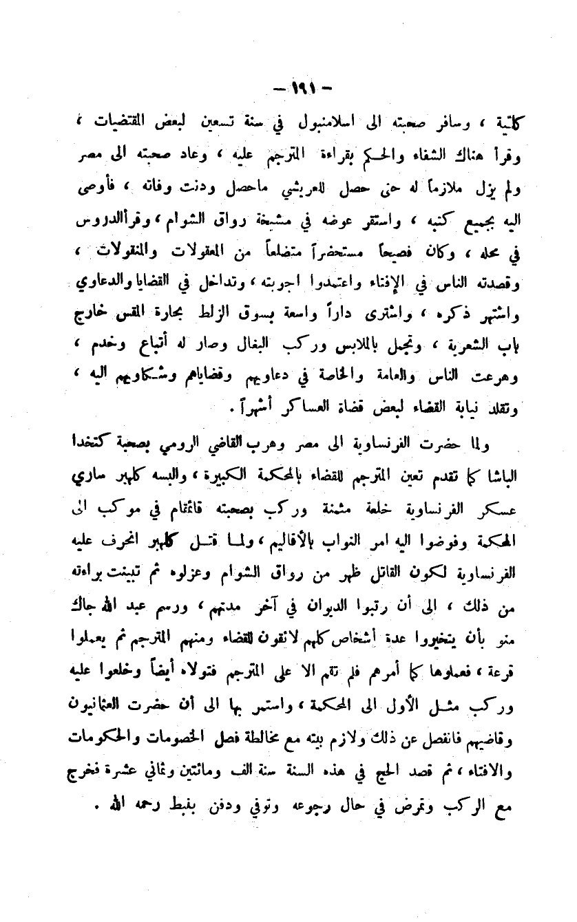 ولما حضرت الفرنساوية إلى مصر وهرب القاضي الرومي بصحبة كتخدا الباشا كما تقدم تعين المترجم للقضاء بالمحكمة الكبيرة، وألبسه كلهبر ساري عسكر الفرنساوية خلعة مثمنة وركب بصحبته قائمقام في موكب إلى المحكمة وفوضوا إليه أمر النواب بالأقاليم، ولما قتل كلهبر انحرف عليه الفرنساوية لكون القاتل ظهر من رواق الشوام وعزلوه ثم تبينت براءته بعد ذلك، إلى أن رتبوا الديوان في آخر مدتهم، ورسم عبد الله جاك منو بأن يتخيروا عدة أشخاص كلهم لائقون للقضاء ومنهم المترجم ثم يعملوا قرعة، فعملوها كما أمرهم فلم تقم إلا على المترجم فتولاه أيضاً وخلعوا عليه وركب مثل الأول إلى المحكمة، واستمر بها إلى أن حضرت العثمانيون وقاضيهم فانفصل عن ذلك ولازم بيته مع مخالطة فصل الخصومات والحكومات والإفتاء، ثم قصد الحج في هذه السنة سنة ألف ومائتين وثماني عشرة فخرج مع الركب وتمرض في حال رجوعه وتوفي ودفن بنبط رحمه الله.