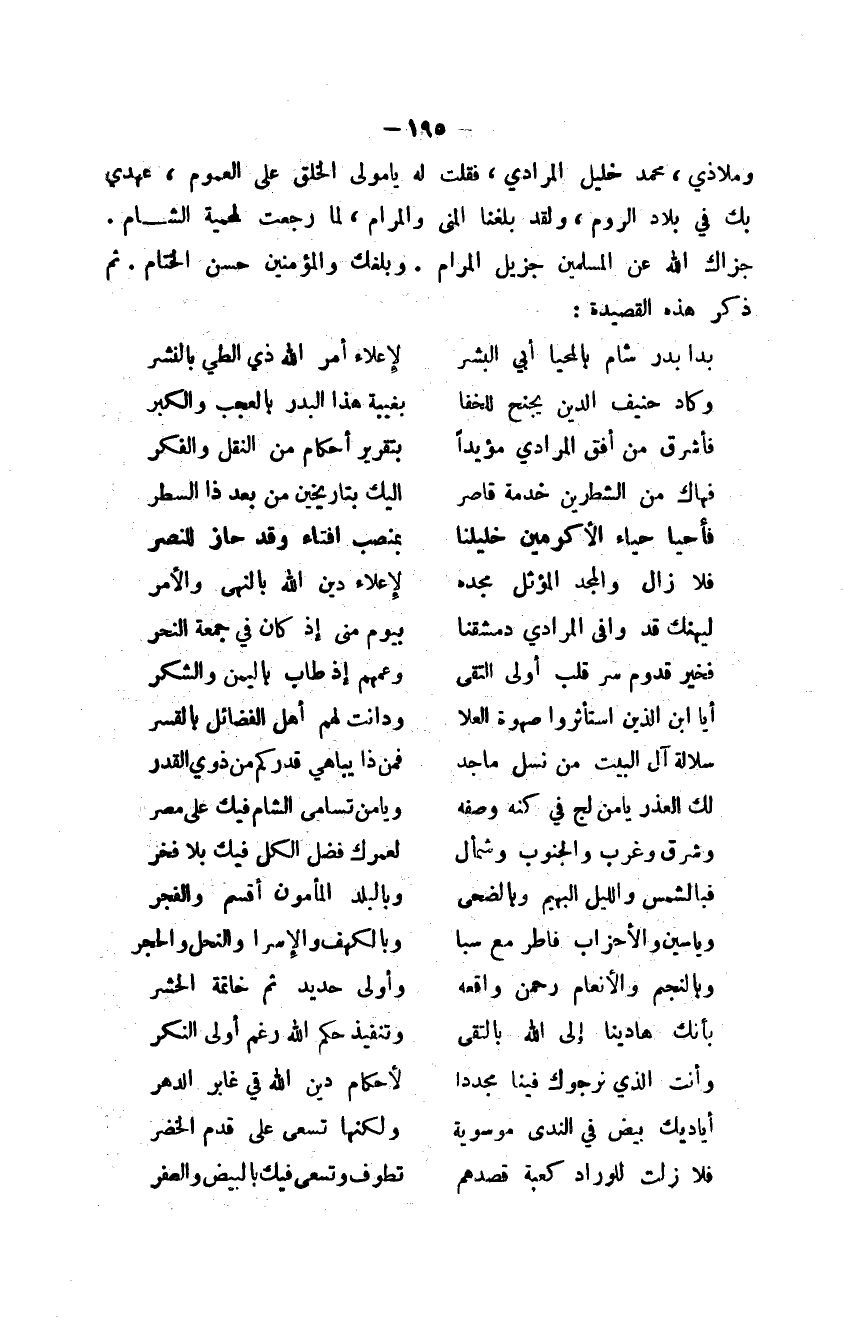 وملاذي، محمد خليل المرادي، فقلت له يا مولى الخلق على العموم، عهدي بك في بلاد الروم، ولقد بلغنا المنى والمرام، لما رجعت لمحمية الشام. جزاك الله عن المسلمين جزيل المرام. وبلغك والمؤمنين حسن الختام. ثم ذكر هذه القصيدة: