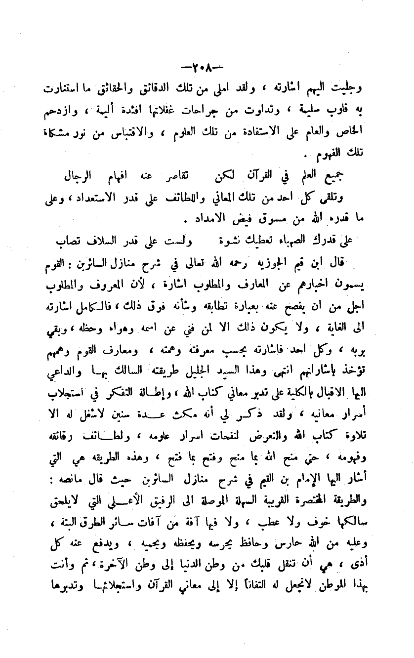 قال ابن قيم الجوزية رحمه الله تعالى في شرح منازل السائرين: القوم يسمون أخبارهم عن المعارف والمطلوب إشارة، لأن المعروف والمطلوب أجل من أن يفصح عنه بعبارة تطابقه وشأنه فوق ذلك، فالكامل إشارته إلى الغاية، ولا يكون ذلك إلا لمن فني عن اسمه وهواه وحظه، وبقي بربه، وكل أحد فإشارته بحسب معرفته وهمته، ومعارف القوم وهمهم تؤخذ بإشاراتهم انتهى وهذا السيد الجليل طريقته السالك بها والداعي إليها الإقبال بالكلية على تدبر معاني كتاب الله، وإطالة التفكر في استجلاب أسرار معانيه، ولقد ذكر لي أنه مكث عدة سنين لا شغل له إلا تلاوة كتاب الله والتعرض لنفحات أسرار علومه، ولطائف رقائقه وفهومه، حتى منح الله بما منح وفتح بما فتح، وهذه الطريقة هي التي أشار إليها الإمام ابن القيم في شرح منازل السائرين حيث قال ما نصه: والطريقة المختصرة القريبة السهلة الموصلة إلى الرفيق الأعلى التي لا يلحق سالكها خوف ولا عطب، ولا فيها آفة من آفات سائر الطرق البتة، وعليه من الله حارس وحافظ يحرسه ويحفظه ويحميه، ويدفع عنه كل أذى، هي أن تنقل قلبك من وطن الدنيا إلى وطن الآخرة، ثم وأنت بهذا الموطن لا تجعل له التفاتاً إلا إلى معاني القرآن واستجلائها وتدبرها