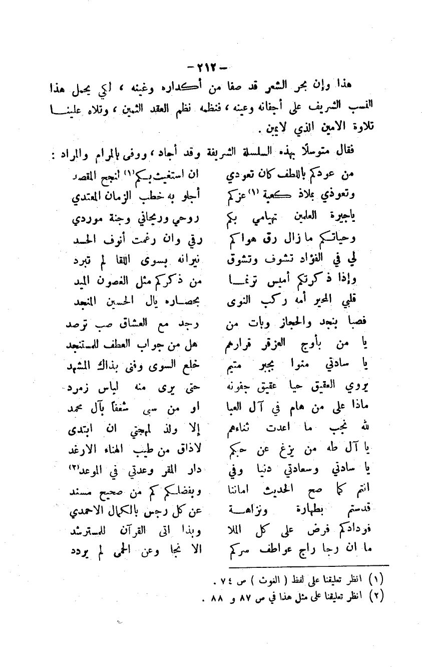 هذا وإن بحر الشعر قد صفا من أكداره وغينه، لكي يحمل هذا النسب الشريف على أجفانه وعينه، فنظمه نظم العقد الثمين، وتلاه علينا تلاوة الأمين الذي لا يمين.