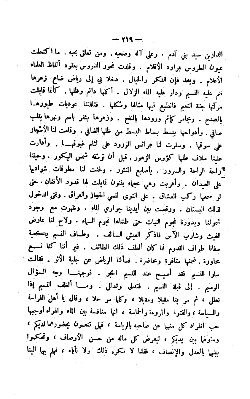 الدارين سيد بني آدم. وعلى آله وصحبه. ومن تعلق بحبه. ما اكتحلت عيون الطروس بمراود الأقلام. وقلدت نحور الدروس بعقود ألفاظ العلماء الأعلام. وبعد فإن الفكر والخيال. دخلا بي إلى رياض ضاع زهرها فنم عليه النسيم ودار عليه الماء الزلال. أكلها دائم وظلها. كأنما قابلت مرآتها جنة النعيم فانطبع فيها مثالها وشكلها. فتلقتنا عوديات طيورها بالصدح. ومجامر كمائم ورودها بالنفح. وزهرها بثغر باسم ونهرها بقلب صافي. وأدواحها ببسط بساط البسط من ظلها الضافي. وقامت لنا الأشجار على سوقها. وسفرت لنا عرائس الورود على لثام غبوقها. وأدارت علينا سلاف طلها كؤوس الزهور. قبل أن ترشفه شمس البكور. وحيتنا راحة الراحة والسرور. بأصابع المنثور. وغنت لنا مطوقات شواديها على العيدان. وأعربت وهي عجماء بفنون تمايلت لها قدود الأفنان. حتى لو سمعها ركب العشاق. على النوى لنسي الحجاز والعراق. وتمنى الدخول لذلك البستان. ورقصت بين أيدينا جواري الماء. وظهرت مع وجود شمولنا وبدورنا نجوم النبات حتى ظنناها نجوم السماء. ولاح لنا عارض الغيث وشارب الآس فاذكر العيش السالف. وطاف النسيم بكعبة صفانا طواف القدوم فما كان ألطف ذلك الطائف. غير أننا كنا نسمع محاورة. ضمنها منافرة ومحاضرة. فسألنا الرياض عن جلية الأثر. فقالت سلوا النسيم فقد أصبح عند النسيم الخبر. فوجهنا وجه السؤال الوسيم. إلى قبلة النسيم. فتدلى وتدلل. وما ألطف النسيم إذا تعلل، ثم مر بنا مقبلاً ومقبلا، وكلما مر حلا، وقال يا أهل الفراسة والسياسة، والفتوة والمروءة والحماسة، إنها منافسة بين الماء والهواء أوجبها حب انفراد كل منهما عن صاحبه بالرياسة، فهل تنعمون بحضورهما لديكم، ومثولهما بين يديكم، ليعرض كل ماله من حسن الأوصاف، وتحكموا بينهما بالعدل والإنصاف، فقلنا لا نكره ذلك ولا نأباه، فهلم بهما إلينا