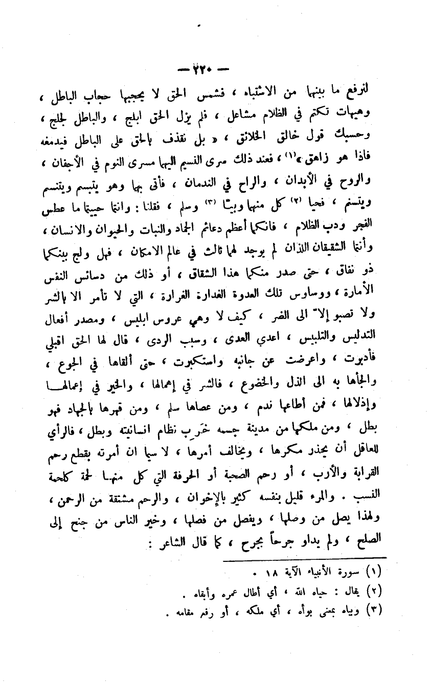 لنرفع ما بينهما من الاشتباه، فشمس الحق لا يحجبها حجاب الباطل، وهيهات تكتم في الظلام مشاعل، فلم يزل الحق أبلج، والباطل لجلج، وحسبك قول خالق الخلائق، " بل نقذف بالحق على الباطل فيدمغه فإذا هو زاهق "، فعند ذلك سرى النسيم إليهما مسرى النوم في الأجفان، والروح في الأبدان، والراح في الندمان، فأتى بهما وهو يتبسم ويتنسم ويتسنم، فحيا كل منهما وبيا وسلم، فقلنا: وأنتما حييتما ما عطس الفجر ودب الظلام، فإنكما أعظم دعائم الجماد والنبات والحيوان والإنسان، وأنتما الشقيقان اللذان لم يوجد لهما ثالث في عالم الإمكان، فهل ولج بينكما ذو نفاق، حتى صدر منكما هذا الشقاق، أو ذلك من دسائس النفس الأمارة، ووساوس تلك العدوة الغدارة الغرارة، التي لا تأمر إلا بالشر ولا تصبو إلا إلى الضر، كيف لا وهي عروس إبليس، ومصدر أفعال التدليس والتلبيس، أعدى العدى، وسبب الردى، قال لها الحق أقبلي فأدبرت، وأعرضت عن جانبه واستكبرت، حتى ألقاها في الجوع، وألجأها به إلى الذل والخضوع، فالشر في إهمالها، والخير في إعمالها وإذلالها، فمن أطاعها ندم، ومن عصاها سلم، ومن قهرها بالجهاد فهو بطل، ومن ملكها من مدينة جسمه خرب نظام إنسانيته وبطل، فالرأي للعاقل أن يحذر مكرهاً، ويخالف أمرها، لاسيما إن أمرته بقطع رحم القرابة والأرب، أو رحم الصحبة أو الحرفة التي كل منها لحمة كلحمة النسب. والمرء قليل بنفسه كثير بالإخوان، والرحم مشتقة من الرحمن، ولهذا يصل من وصلها، ويفصل من فصلها، وخير الناس من جنح إلى الصلح، ولم يداو جرحاً بجرح، كما قال الشاعر: